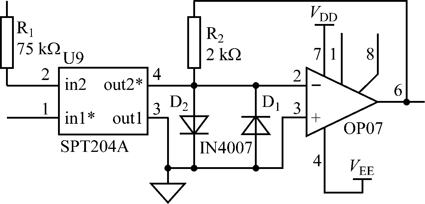 信号调理电路以SPT204A(0.1级)微型电流型电压互感器为核心,配合其外围应用电路实现信号的量程变换与强弱电隔离。SPT204A额定输入、输出电流均为2 mA,其测量精度高、无漂移、耐冲击性强,完全能满足测量要求[6]。信号调理电路如图2所示。