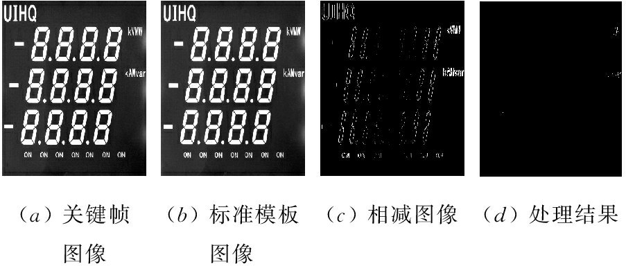 寻找到最佳模板之后,系统需要对图像进行检测识别,判断仪表是否符合开机要求。将匹配到的最佳模板与标准模板相减,计算绝对值,组成差异化图像数组。将差异化图像数组进行二值化滤波,消除因光线等外界因素产生的微小偏差。检测二值化后的差异化图像数组的联通模块,将因为位置偏差等因素造成的小模块去除,保留面积较大的模块。最后通过检测差异化图像数组是否存在面积大的模块来识别图像是否和标准模板一致,如图8所示。