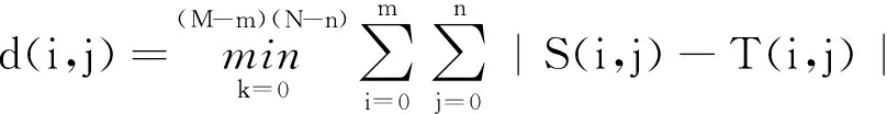 式中:d(i,j)为最佳匹配子模块;(i,j)为像素点的坐标;S(i,j)为与模板大小一样的子模块数组;T(i,j)为模板数组。