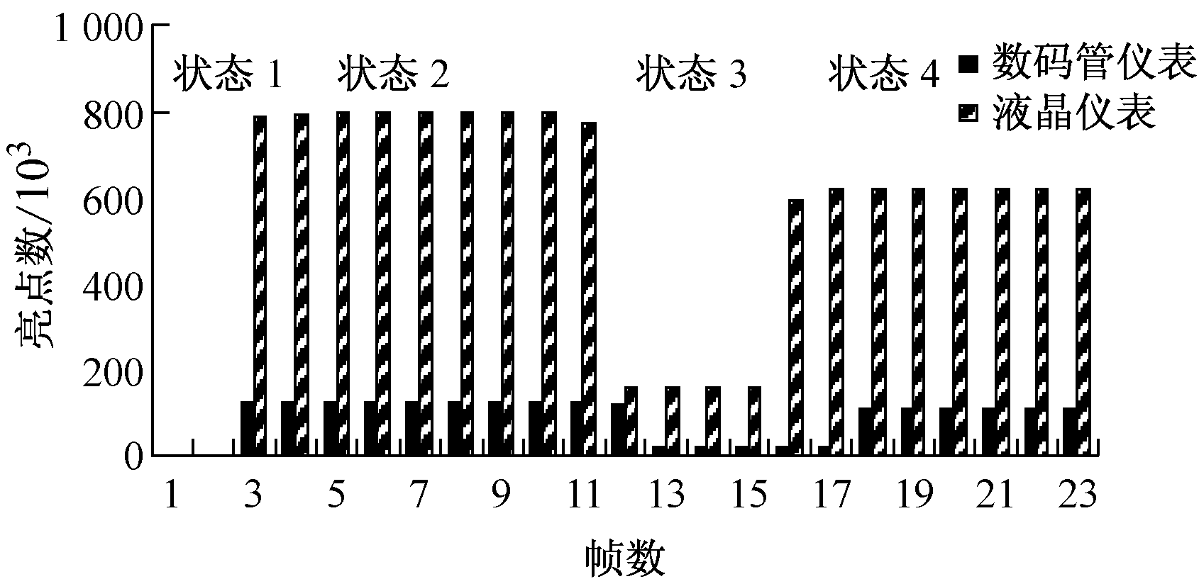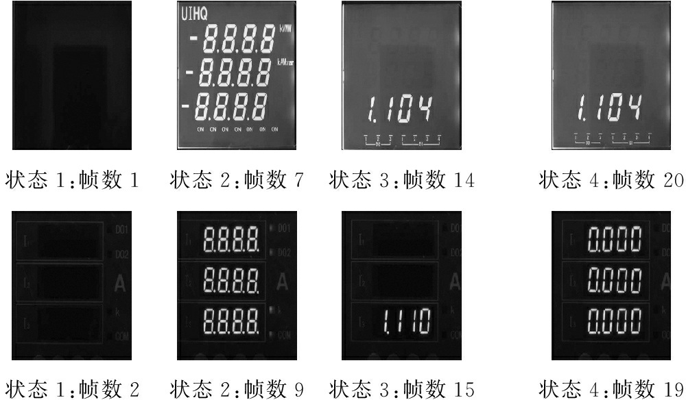 开机视频可以分解为不同帧的图像。对于每一帧图像,系统将分通道处理,二值化每一个像素点,然后统计亮点的个数。以一个开机显示2路信号的电压表为例,统计亮点数的变化规律,如图4所示,开机图像如图5所示。开机瞬间,亮点数增加,之后仪表进入一个稳定的过程,即状态2,其对应的图像如图5中的状态2。第1个显示信号稳定一段时间后,仪表开始切换到第2个信号点并在一段时间内保持稳定,对应的图像为图5中的状态3。仪表完成开机后,切换到正常零输出状态,开机结束。