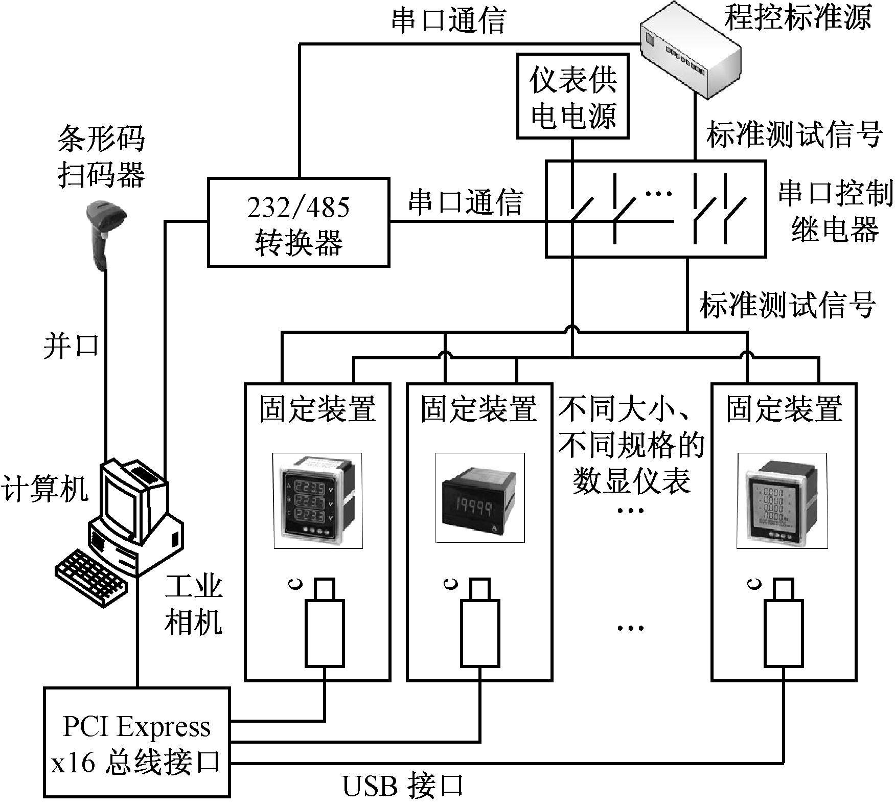 计算机通过并口、PCI总线和串口分别与工业相机和程控标准源及供电电源连接。由于电测量仪表显示器本身发光,所以外界光源影响较小,无需添加辅助光源。当计算机控制工业相机开始录像时,计算机通过控制串口控制继电器接通仪表的供电电源,使仪表自动开机。仪表开机完毕后,计算机控制工业相机停止录制,保存仪表开机录像,检测所需的数据采集是否完成。进行精度检测时,计算机控制标准测试电源加载测试信号,并通过工业相机采集图像,对显示结果进行识别。