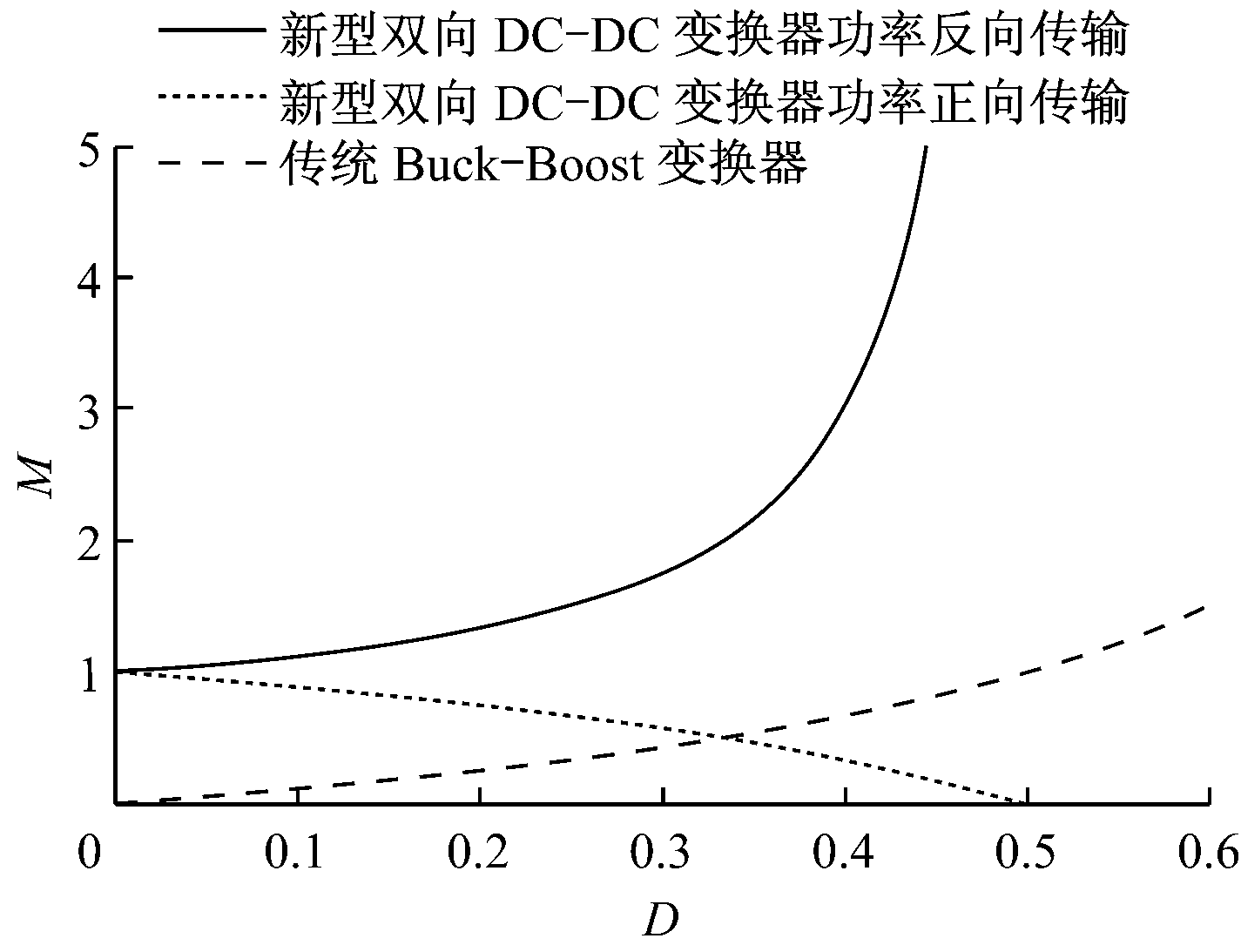 根据传统Buck-Boost变换器和新型双向DC-DC变换器的电压增益公式,采用Matlab/Figure软件绘制2种变换器电压增益曲线,如图5所示。可看出0<D<0.6情况下,新型双向DC-DC变换器功率反向传输时理论上可实现无限大的输出电压,且具有相同占空比条件下,其电压增益大于传统Buck-Boost变换器,满足高电压输出需求;当具有相同电压增益时,其开关导通时间较短,有利于功率开关器件散热[7]。
