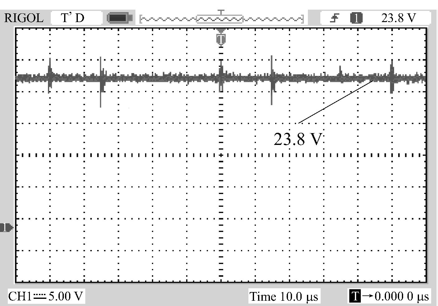 新型双向DC-DC变换器功率反向传输时,蓄电池放电,用数字万用表测得蓄电池两端输出电压U0=13.8 V,调节占空比D=30%,经新型双向DC-DC变换器升压后即得到适用于负载工作的电压,实验波形如图7所示。