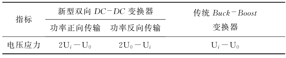 具有相同输入、输出电压,相同负载的2种电路拓扑结构,其功率开关器件承受的电压应力也会有所不同[7]。假设新型双向DC-DC变换器及传统Buck-Boost变换器的输入电压为Ui,输出电压为U0,通过计算可得2种变压器功率开关器件的电压应力,见表1。