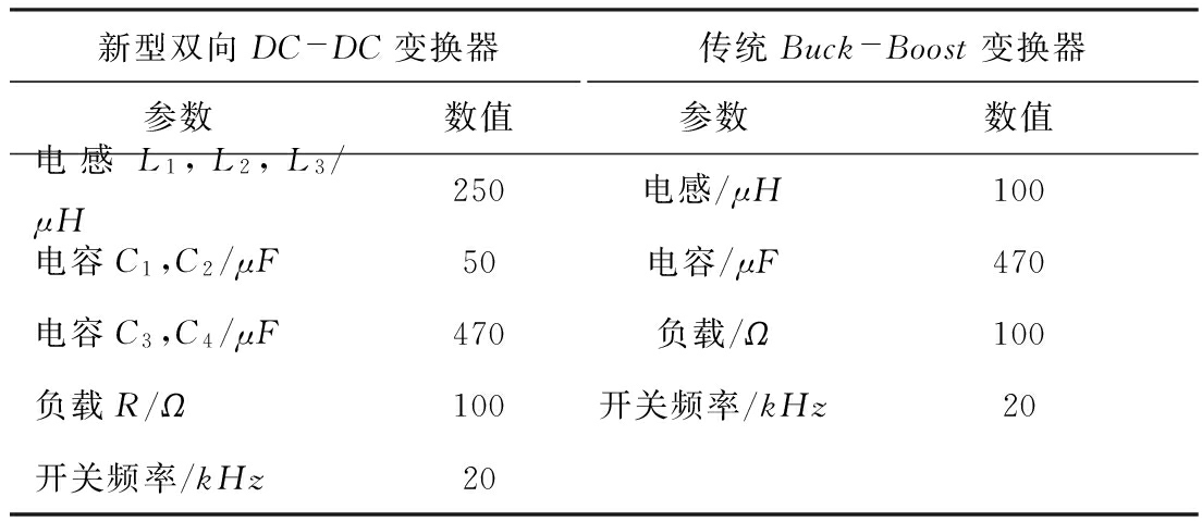 由于传统Buck-Boost变换器输出与电源极性相反的电压,而新型双向DC-DC变换器电源极性与输出电压极性相同,根据表1数据可知,新型双向DC-DC变换器具有较小的开关电压应力,可减小开关器件的发热程度,提高开关器件的使用寿命。