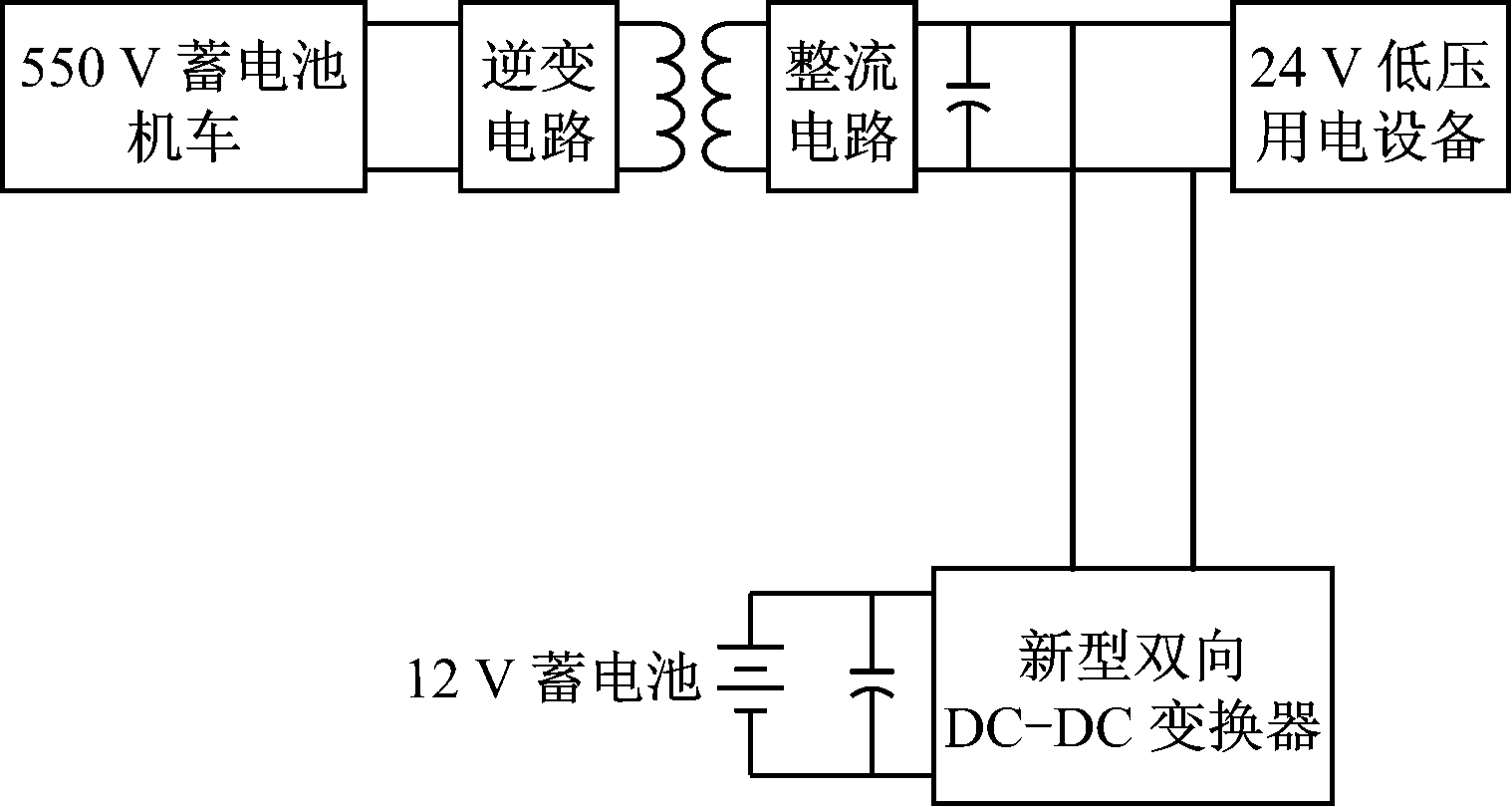 蓄电池机车是煤矿井下的主要动力设备,负责人员、物料运输。蓄电池机车一般由车载550 V蓄电池供电。电源经逆变器、高频变压器和整流装置降压后,可为机车上的24 V低压用电设备,如照明、电笛、通信、综合检测保护装置及其他控制设备提供电能[4]。当机车停电或发生故障时,低压用电设备也会断电,给井下生产造成不便。为了避免该种情况,在蓄电池机车中加入新型双向DC-DC变换器,如图1所示。该DC-DC变换器正向工作时,将低压用电设备两端的直流电源降压为适用于12 V蓄电池两端充电的电压;当机车停电或发生故障时,12 V蓄电池放电,经DC-DC变换器升压后为24 V低压用电设备供电。这使得低压用电设备供电不间断,即使出现异常情况也能正常工作。