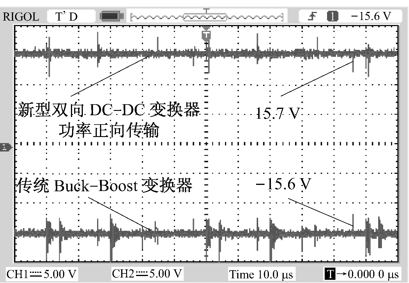 从图6可看出,在具有相同大小的输入、输出电压,相同负载条件下,与传统Buck-Boost变换器相比,新型双向DC-DC变换器输出电压毛刺较少,稳定性较强,电压质量较高。