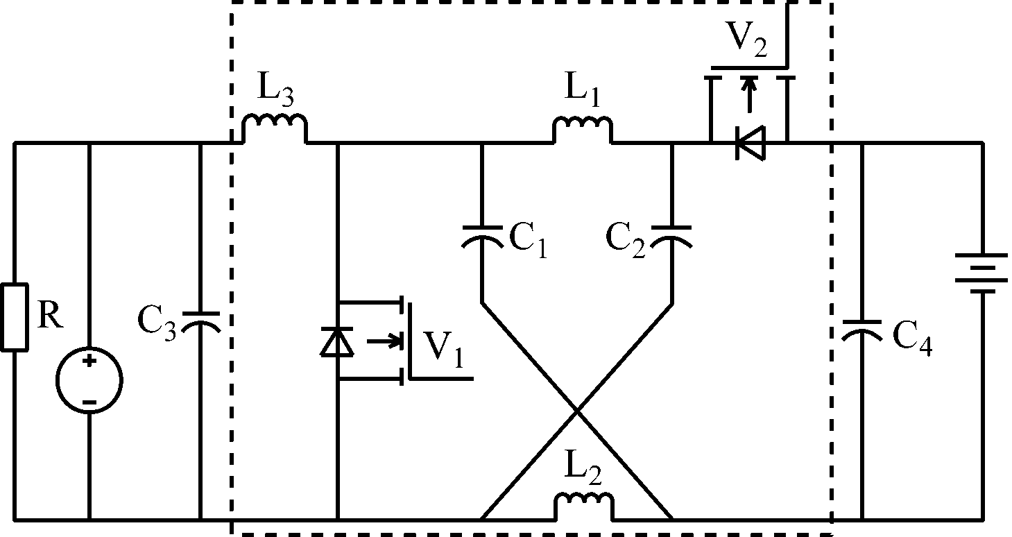 新型双向DC-DC变换器在输入直流电源和负载之间采用Z源网络进行连接[5],如图2所示,其中虚线框内为双向DC-DC变换器拓扑结构。该新型双向DC-DC变换器输入可为任意类型直流电源,输出采用蓄电池组储能,功率正向传输时可给蓄电池组充电,功率反向传输时蓄电池组可为直流负载提供电能。图2中Z源网络是由2个相同电感(L1,L2)和2个相同电容(C1,C2)组成的X形网络,双向电力电子开关(V1,V2)采用MOSFET或IGBT/Diode开关器件。