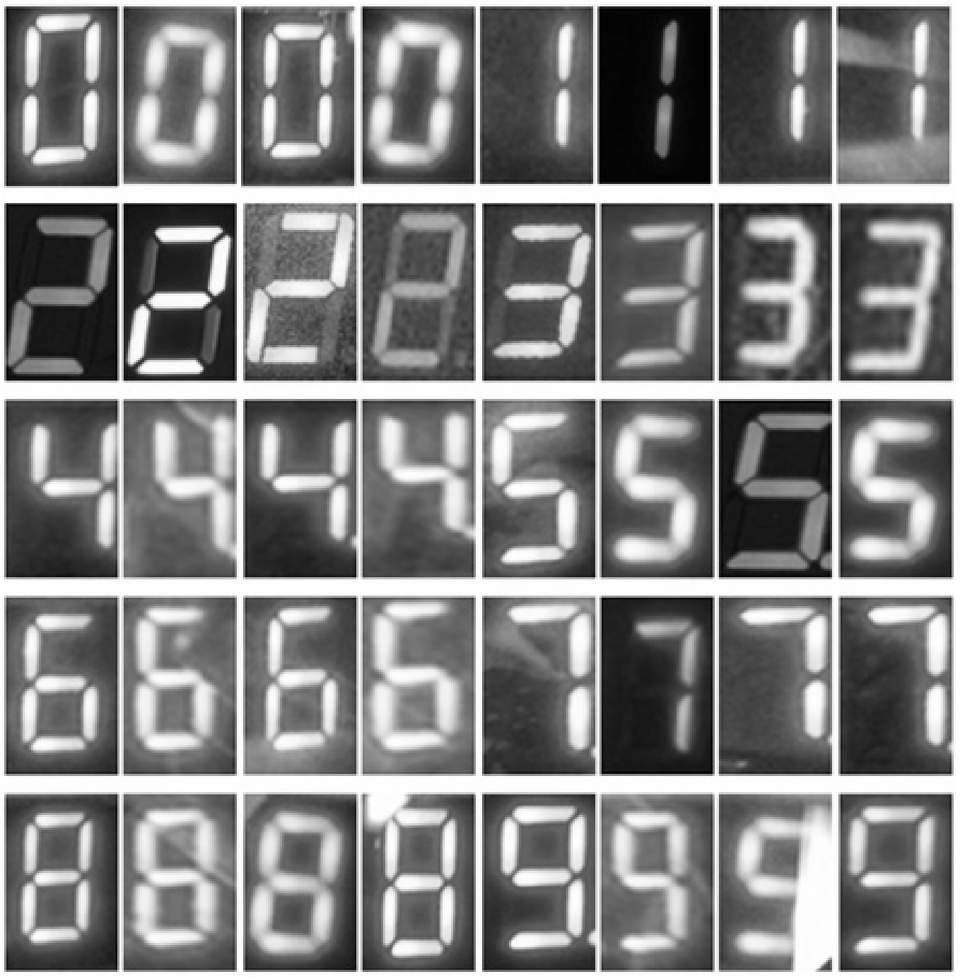 实验采用自建字符图像库进行测试,字符库包含10种字符,每种字符选取110张图像,其中有些字符表面受到光照、薄膜影响。部分字符图像如图2所示,每种字符选取35幅图像用作测试,剩余图像作为训练图像。
