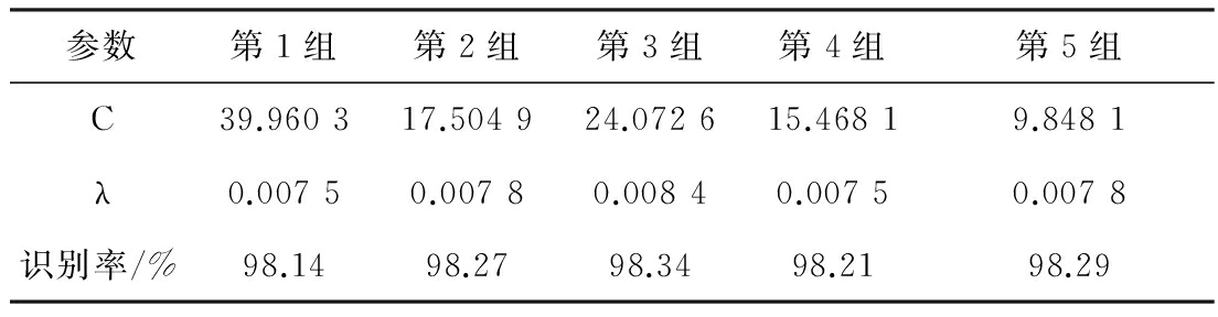 使用遗传算法进行参数寻优在开始阶段选择的种群具有随机性,因此,对于相同训练数据,每次参数寻优的结果并不一致,对数据进行5组实验,遗传算法参数寻优结果见表1。改进遗传算法参数寻优结果见表2。
