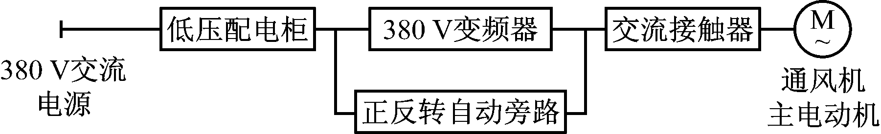 通风系统主备用通风机均为对旋轴流式通风机,主要通风机主电动机功率为2×200 kW,备用通风机主电动机功率为3×185 kW。轴流式通风机风量调节方法有调整叶片角和调节通风机转速2种方法[1]。考虑到随风筒长度要增加供风量的关系,采用变频调速调节风量。因此,通风系统主电动机的电气传动采用380 V低压变频调速和以变频调速为主、改变叶片角为辅的方法实现通风风量的自动调节。通风机通过主电动机反转实现反风。通风系统组成如图1所示。