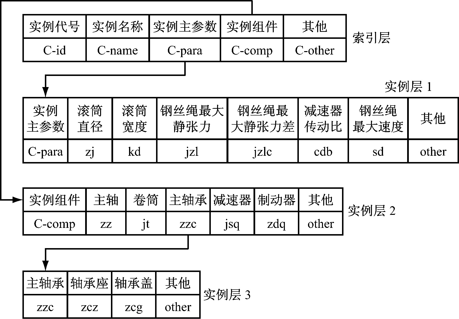 矿井提升机实例库的多层次抽象实例模型包括索引层和实例层2个大层,如图3所示。索引层位于树的根部,提供了实例代号、名称等索引参数,用于在实例查询中与查询实例参数进行匹配。实例层按照等级划分为若干层,再逐层分解为若干结点实例,最底层由基本实例组成,称为叶子实例。按照从提升机装配体、子装配体到零件的顺序逐级降低,分层次存储实例的具体情况。