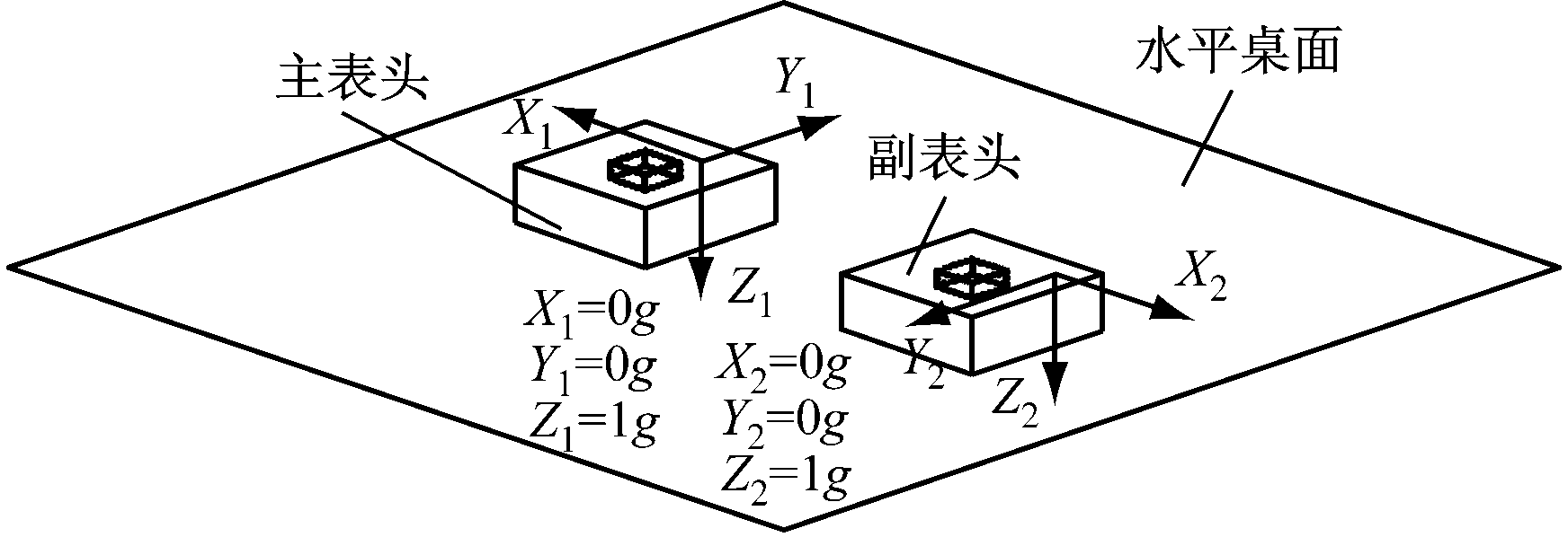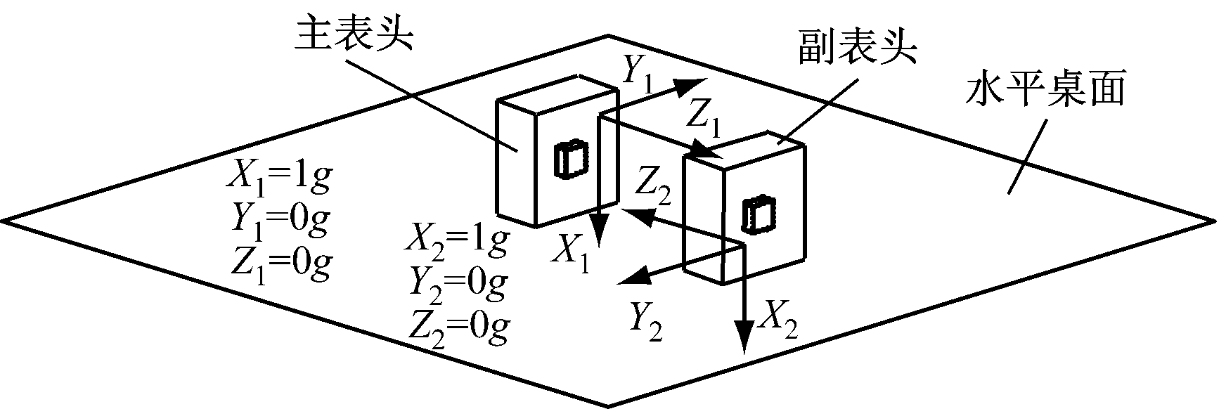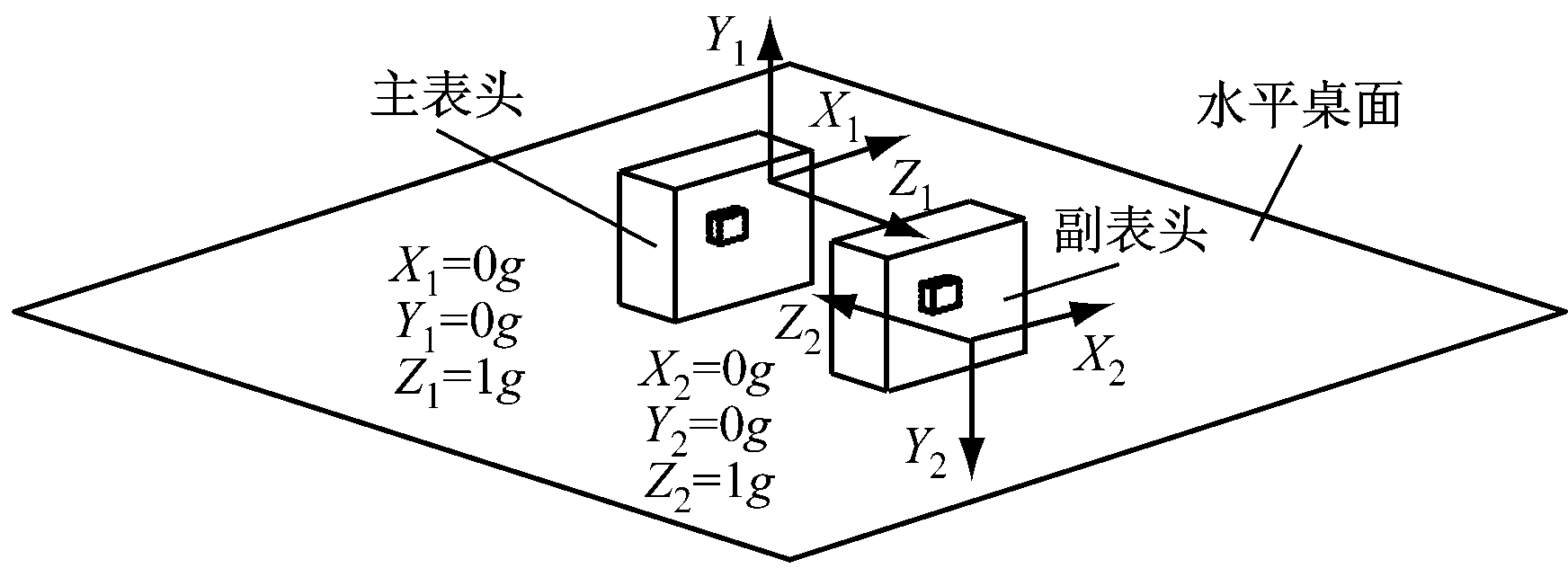 步骤2:摆放稳定后,主表头Y轴上分量为-1g,副表头Y轴上分量为1g,2个表头的X轴和Z轴上分量均为0g,按下专用按键,传感器记录AD数据。