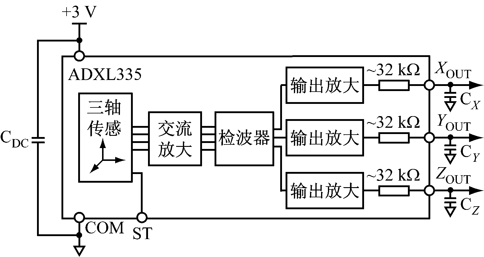 传感器采用ADXL335三轴加速度传感芯片,它具有功耗低、抗冲击能力强、温漂小和驱动能力强的特点。三轴加速度传感芯片结构如图6所示。