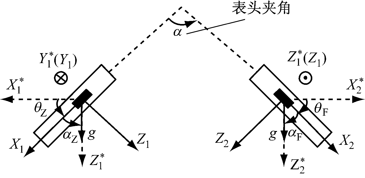 传感器安装后,表头间夹角α由αZ和αF两个部分构成,如图4所示。其中,αZ为重力g与主表头三轴加速度传感芯片X1轴间的夹角;αF为重力g与副表头三轴加速度传感芯片X2轴间的夹角。X1OZ1平面和X2OZ2平面重合,重力矢量也在该平面变化。选择主表头内加速度传感芯片的参考坐标系为