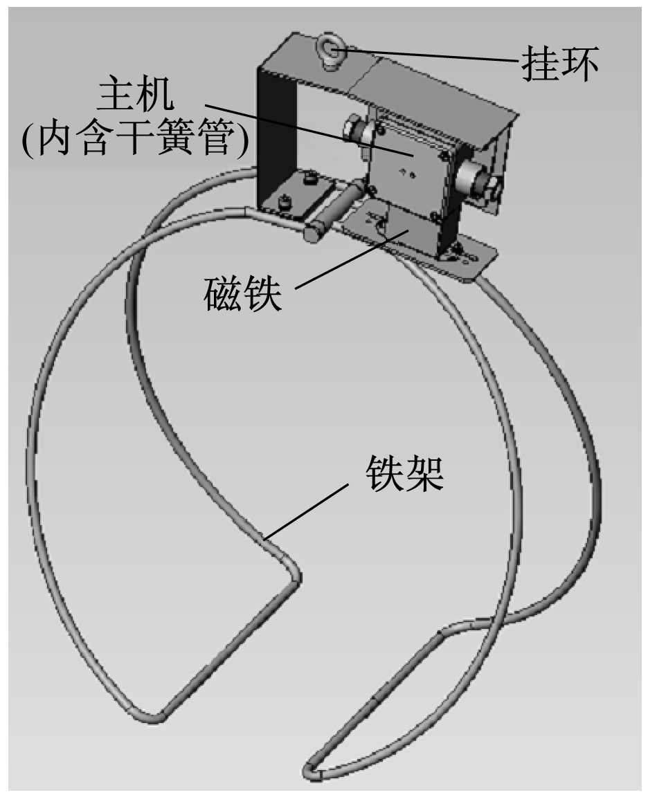 矿井通风是煤矿安全生产的重要保障,风筒风量开关传感器是检测矿用软质风筒通风状态的重要设备。目前该类传感器几乎都是铁架式,如图1所示。它采用挂环悬挂安装,铁架环抱骑跨于风筒之上。当风筒有风时,风筒鼓胀撑开铁架,使得磁铁靠近主机,触发主机内部干簧管导通;当风筒风量不足时,风筒干瘪下垂,铁架收拢,使得磁铁远离主机,触发内部干簧管断开。