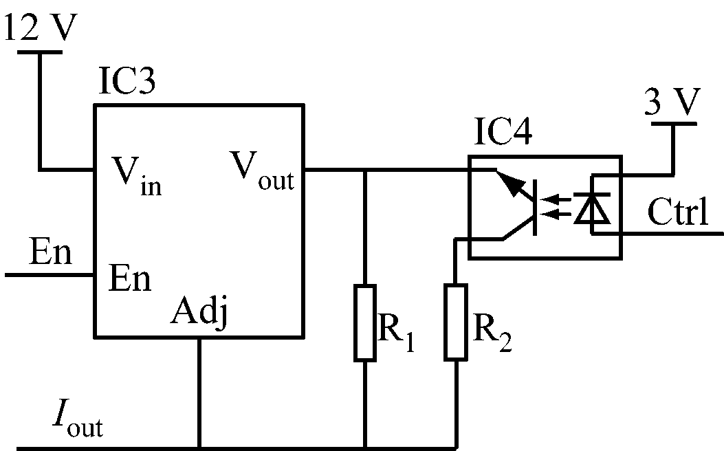 传感器的1/5 mA开关量电流输出电路采用LDO芯片与光耦来实现,如图7所示。单片机的控制信号为En和Ctrl,电流输出信号为Iout。LDO芯片IC3的电源输出由En控制,当其置低时,IC3无电源输出,Iout为0;当En置高时,IC3有12 V电源输入。在IC3的Vout与Adj之间的电压固定为1.25 V,Adj的漏电流在μA量级,因此,Iout由2条回路得到:一路由R1构成,调节其电阻大小即可输出1 mA电流;另一路由R2和光耦IC4构成,调节R2电阻大小可使该路输出4 mA电流。单片机输出的控制信号Ctrl可控制后者通断,实现1/5 mA电流的输出。