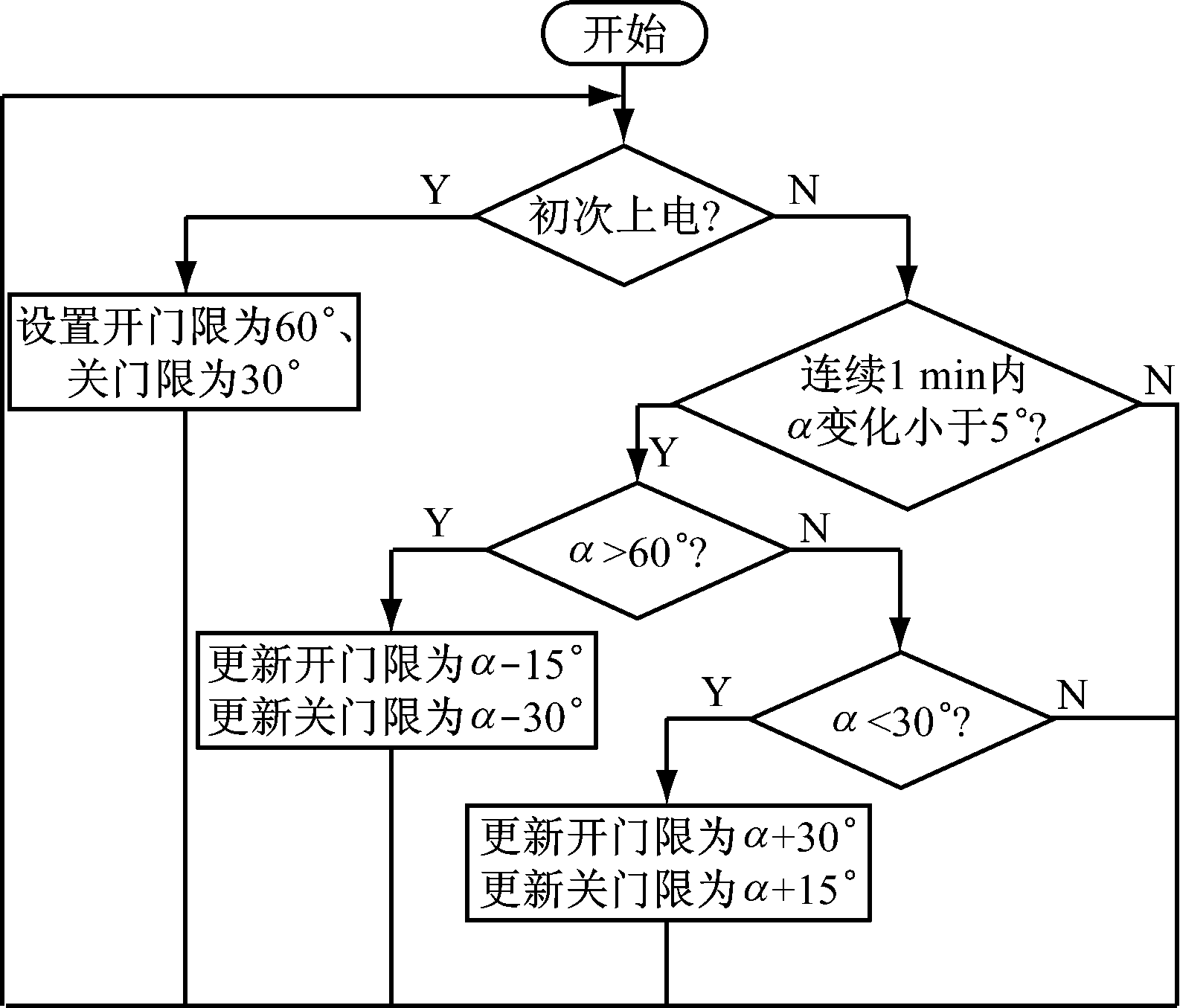 为加快传感器的响应时间,软件设计了判决门限自动更新功能。当检测到α在连续一段时间内处于一个比较稳定的数值时,则会根据这个角度更新判决门限,进而提高判决的响应速度。开门限和关门限的自动更新流程如图8所示。