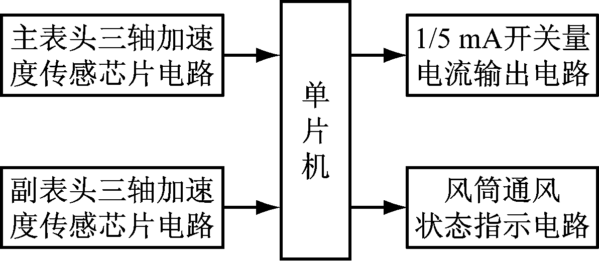 根据测量原理和设计功能,传感器硬件电路组成如图5所示,主要包括三轴加速度传感芯片电路、单片机、1/5 mA开关量电流输出电路、风筒通风状态指示电路。其中,三轴加速度传感芯片电路和1/5 mA开关量电流输出电路是设计的关键点。