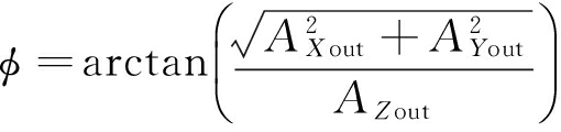 三轴加速度姿态检测原理:三轴加速度传感芯片静止时只受到重力作用,重力g在芯片的XYZ三轴的分量即可表征物体的姿态。三轴与芯片封装棱边重合,相互垂直。当芯片水平放置时,X轴和Y轴位于水平面(0g场),Z轴与水平面垂直(1g场),方向与重力相反。在描述芯片的姿态时,将三轴的坐标系作为参考姿态[3],如图2(a)所示。当芯片发生姿态变化,三轴指向随之改变,如图2(b)所示。θ为芯片X轴与参考坐标X轴的夹角,Ψ为芯片Y轴与参考坐标Y轴的夹角,φ为芯片Z轴与参考坐标Z轴的夹角。静止状态下,通过检测芯片XYZ轴上的重力分量AXout,AYout和AZout,可计算出θ,Ψ和φ[4-6]。计算公式为