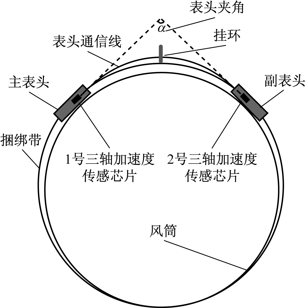 传感器由主副表头(内含三轴加速度传感芯片)、挂环、表头通信线和捆绑带组成,如图3所示。主副表头骑跨于风筒上部,挂环用于固定悬挂,捆绑带从下部环抱风筒,使得2个表头紧贴风筒。2个表头间的夹角为α。当风筒内部风量变化时,表头姿态发生变化,最明显的变化就是表头夹角α,其值在无风时较小,有风时较大。对姿态的检测即是对该夹角的检测。通过检测芯片在XOZ平面的倾角变化就可以计算出α。而Y轴分量可辅助检测传感器安装姿态是否正确,提高了稳定性。