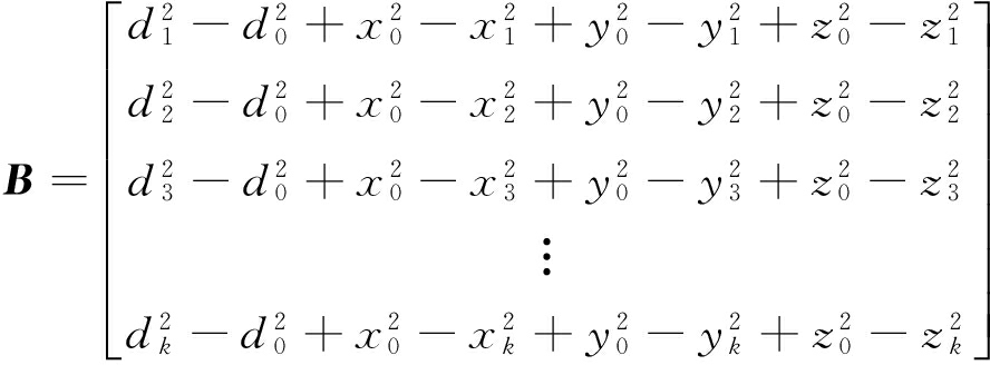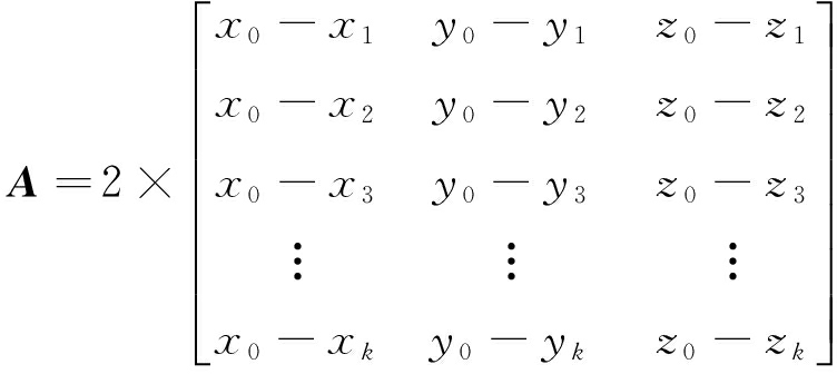 根据个人标签到各定位探测器的距离,考虑三维平面定位环境,可得k+1个距离方程: