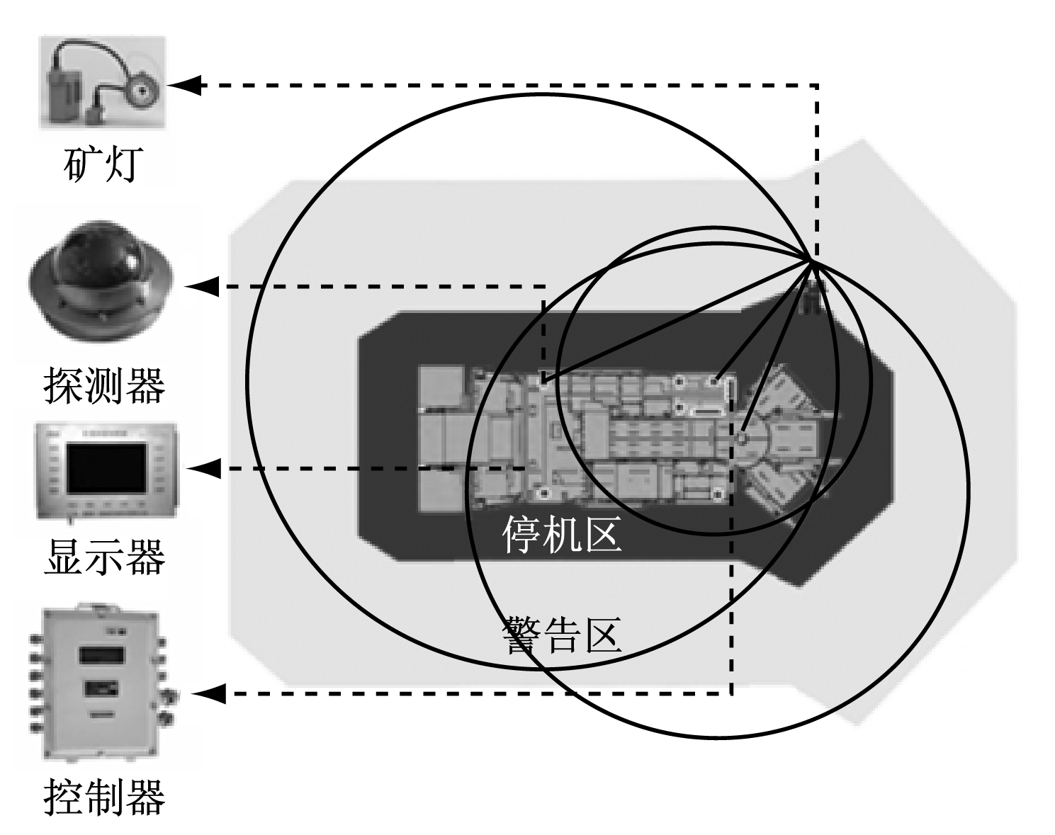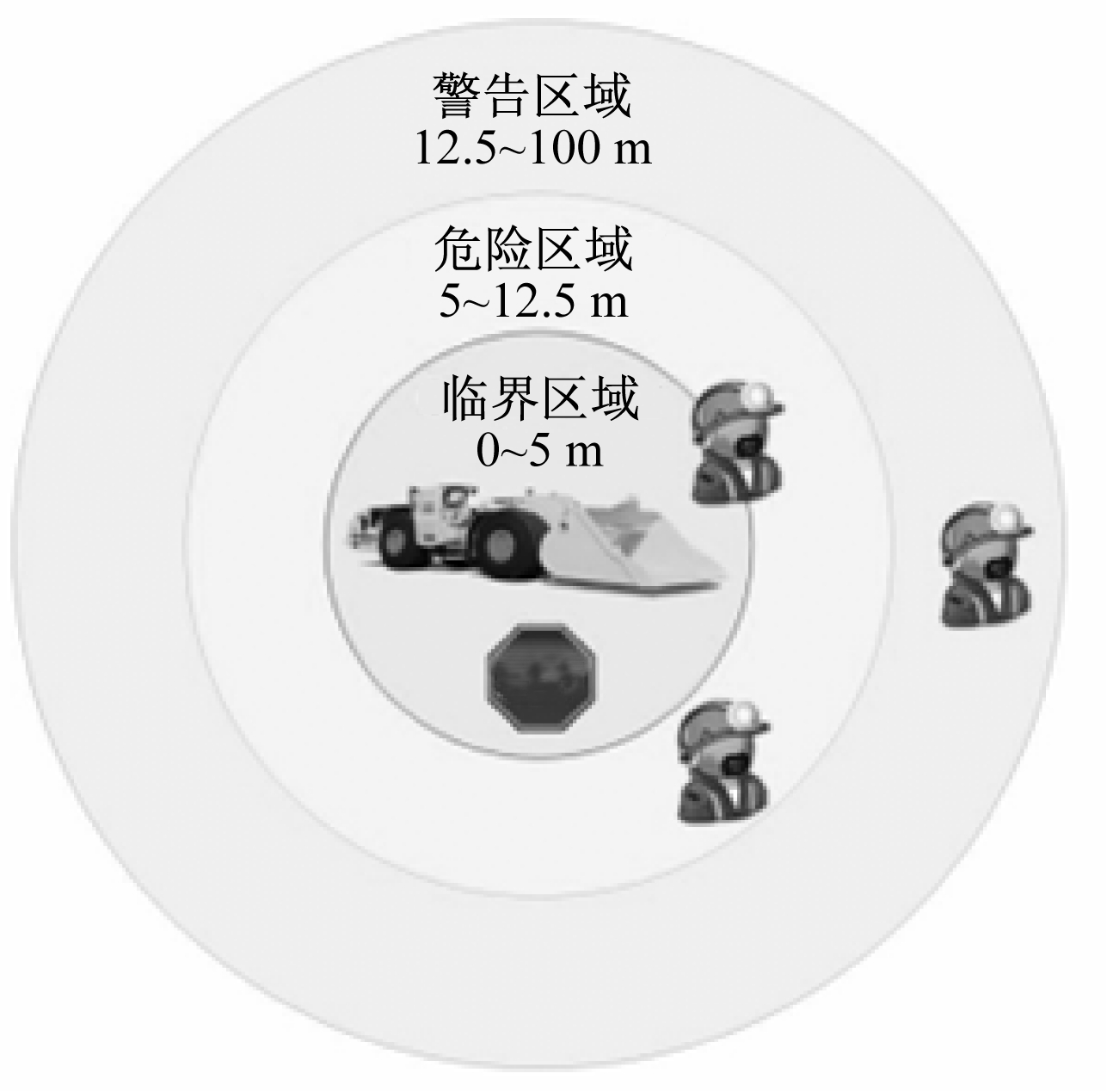 采用RSSI技术的代表性产品是CAS(Collision Avoidance System)系统[2]。CAS系统采用433 MHz的RFID标签,标签识别距离在5~100 m内可调,安装在机械设备上的接收器通过监测标签识别矿工是否进入危险区域,从而达到防碰撞的目的,如图1所示。