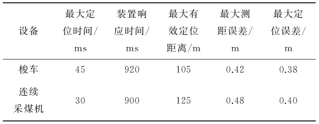 试验过程中分别以10台信息化矿灯,从每个装备自身和周边不同位置进行测试和统计,试验结果见表1。从表1可以看出,本文所提方法的定位精度可达0.5 m以内,定位距离可达100 m,响应时间可达1 s以内,能够满足煤矿安全生产对于井下设备接近探测的应用需求。