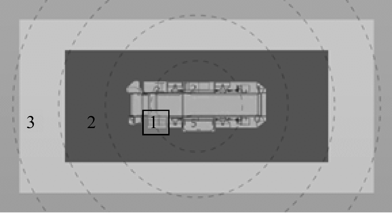 图3的中心区域是一台梭车的俯视图,在梭车的驾驶室内标号为1的区域为操作区域,当标签处于该区域时,设备正常运行;标号为2的区域为危险区域,当标签进入该区域时,设备自动停机;标号为3的区域为警告区域,当标签进入这个区域时,系统发出双向预警。