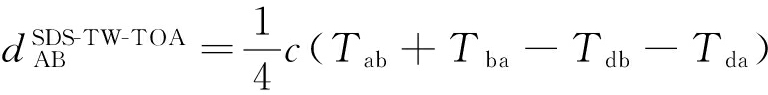 式中:c为电磁波传播速度常数,c=3×108m/s;Tab为节点A自发出测距帧到收到响应帧间的时间延迟;Tba为节点B自发出测距响应帧到收到二次响应帧间的时间延迟;Tdb为节点B自收到测距帧到发出响应帧间的时间延迟;Tda为节点A自收到测距响应帧到发出二次响应帧间的时间延迟。