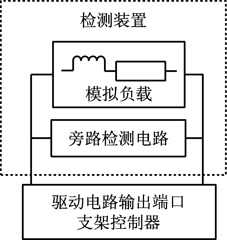 电磁驱动单元的输出为功率型输出,负载为电磁铁[22],是一个3 000~4 000匝、电阻为100~120 Ω的感性负载,电磁铁的额定电压为12 V,额定电流为120~180 mA,负载功率为2~3 W。电磁驱动电路模拟检测系统如图3所示,检测装置使用100 Ω/3 W电阻及电感线圈作为模拟负载[23],并构建旁路检测电路,使用高精密电阻检测驱动电路负载电流,对驱动电路负载驱动能力进行测试[24]。通过测试程序把指定的电磁驱动指令发送给检测装置,检测装置读取对应的电磁驱动检测单元,判定电磁驱动端口线路是否正确,对支架控制器的电磁驱动能力进行测试。另外,还可以通过编制测试程序,循环驱动计数进行驱动电路的寿命试验,检测功率型器件的耗散功率是否满足系统可靠性要求。