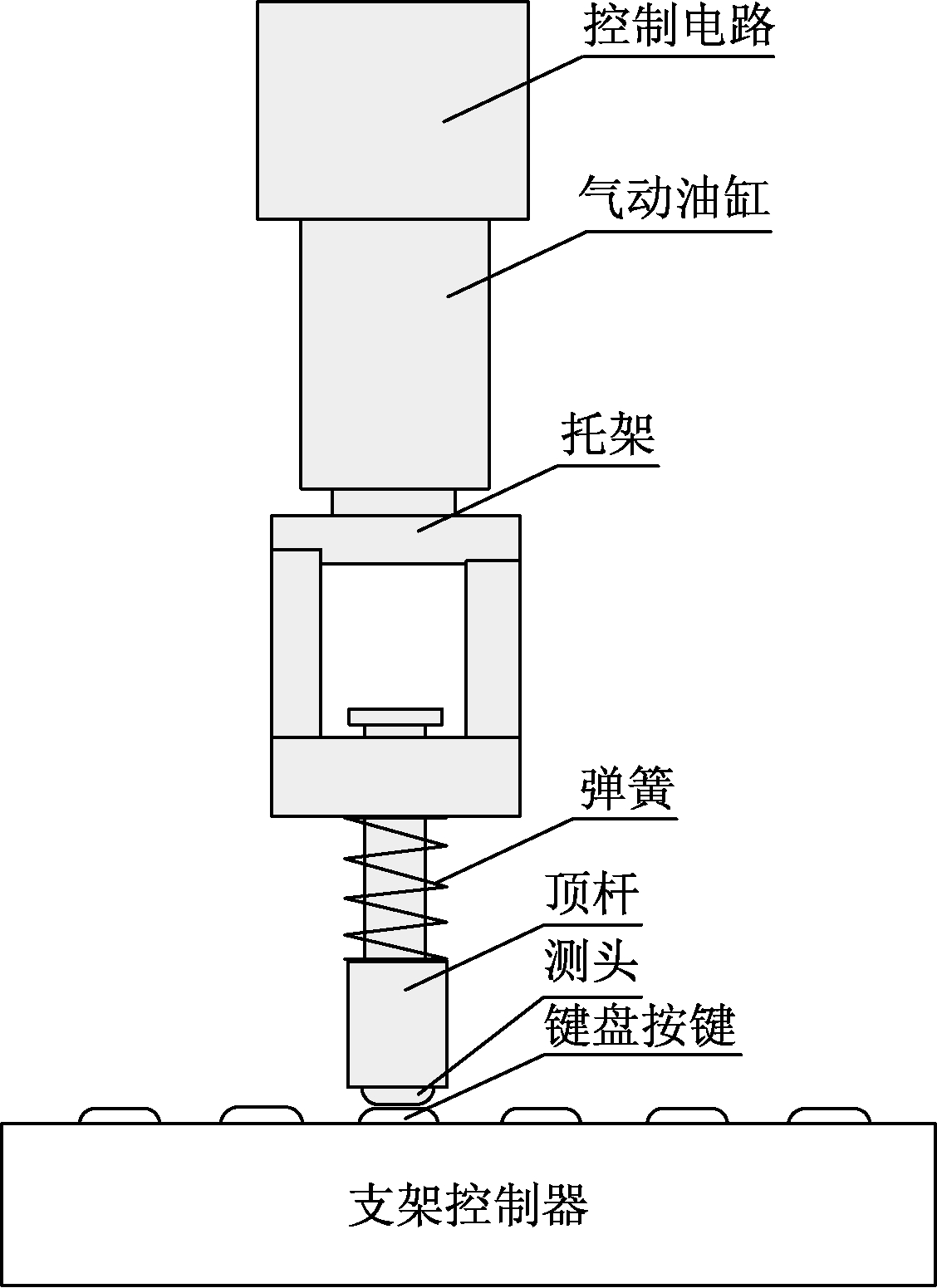 按键自动检测装置由托架、气动油缸、控制电路、顶杆、弹簧、测头等组成,如图2所示。顶杆、弹簧、测头构成一个按键组件,通过托架将按键组件定位,并通过螺帽锁定,托架还起着对按键组件的支撑导向作用,托架的另一端固定在气动油缸上。当控制电路控制气动油缸活塞的伸出和收回时,通过托架压缩弹簧给键盘按键施加压力,气缸行程为2~15 mm,调整弹簧力度使其按键操作力不小于0.5 N。测头为具有弹性的硬橡胶,以防止试验时操作机构对键盘按键造成机械损伤。控制电路以ARM7为核心,通过编程,控制电路可以控制气缸伸出或收回,以实现对支架控制器键盘的自动按键操作。通过编程,控制电路可以精确控制测头按键延时,实现键盘的双键连锁控制、多键顺序控制和单键持续按键操作,以满足支架控制器操作需求,同时还可以对键盘进行连续操作并计数,完成对键盘的寿命试验。