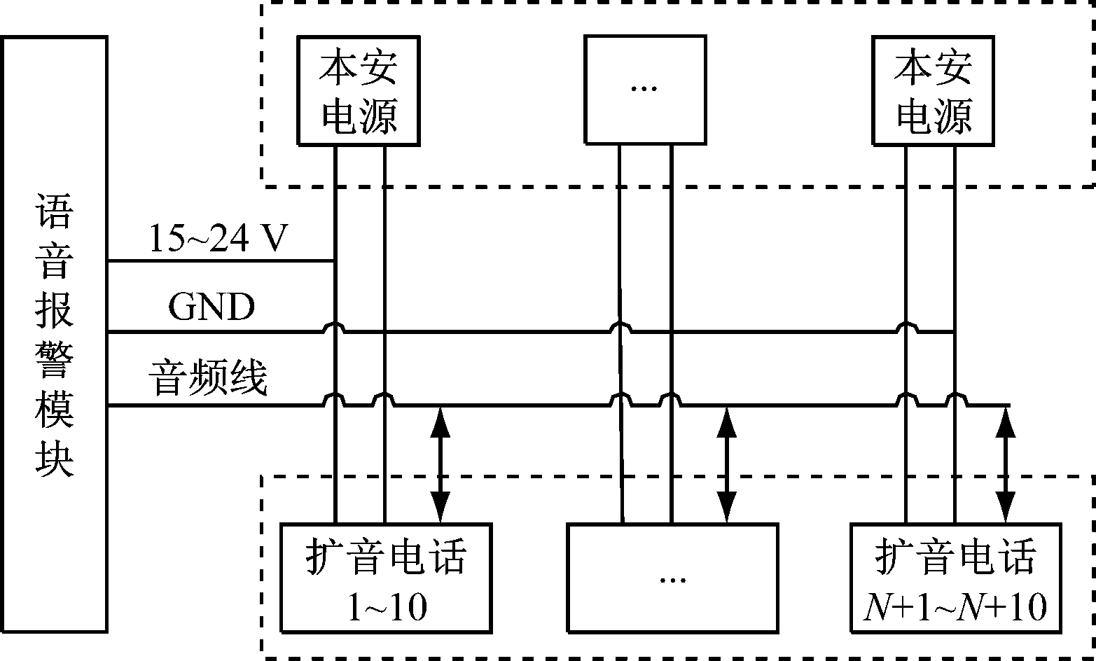 根据系统设计要求,并遵照井下电气设备本质安全型设计的相关规范,确定了系统结构框图,如图1所示。系统由语音报警模块、多部扩音电话和本安电源组成。语音报警模块布置在带式输送机机头,扩音电话和本安电源布置在胶带沿线,各部分之间通过音频线和电源线即可连接,具有良好的可扩展性。系统正常工作电压为DC15~24 V,每个本安电源可为10部扩音电话供电,语音报警模块由靠其最近的本安电源供电。