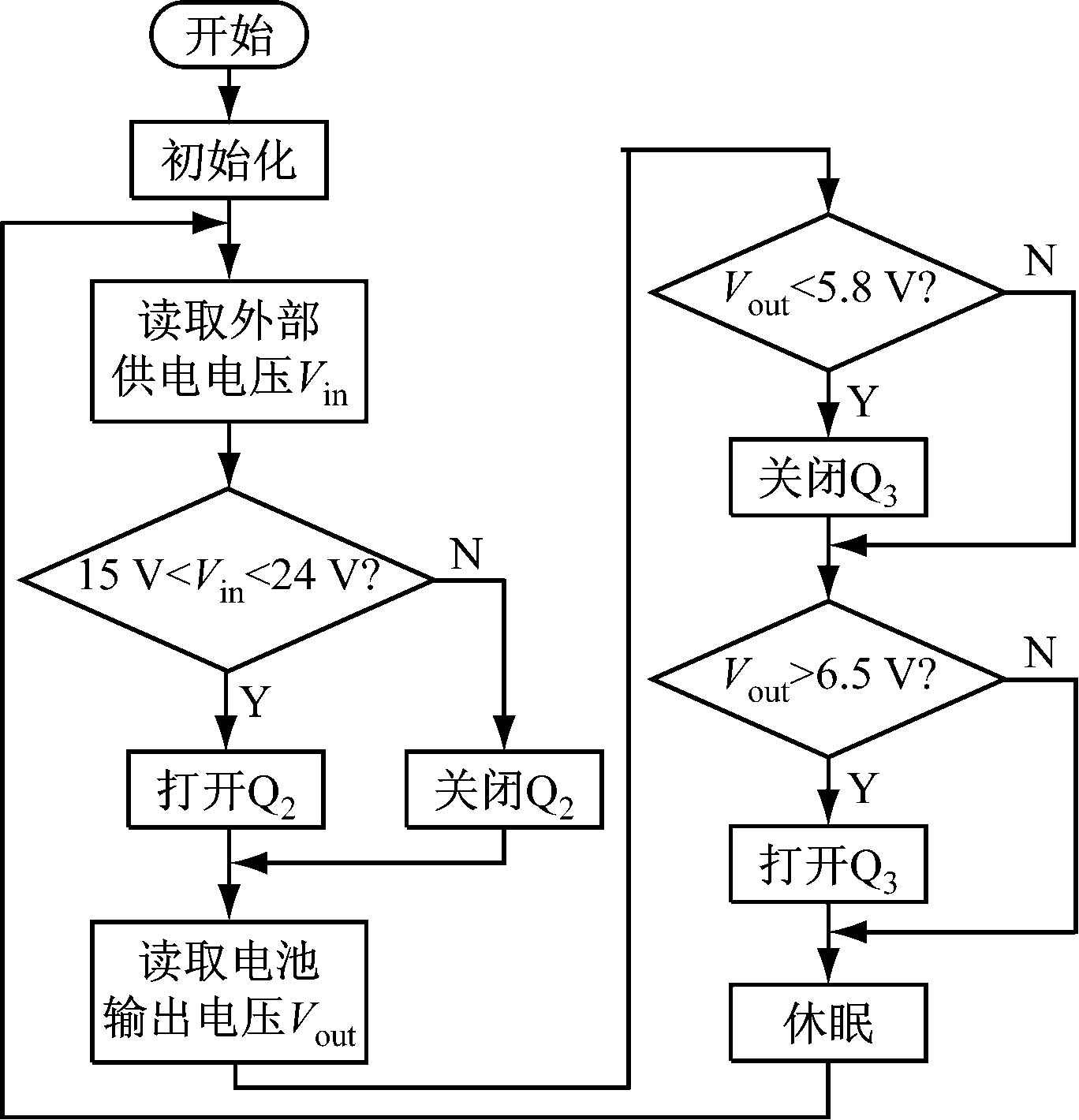 为了保障电话在短时间断电情况下正常工作的能力,同时有效降低镍氢电池管理电路的功耗,单片机处于休眠状态,通过定时唤醒监测外部供电电压和电池组输出电压。外部供电电压为DC15~24 V,充电回路工作在最佳状态。图5中,当15 V<Vin<24 V时,打开Q2进行充电,否则关闭Q2,切断充电回路。为了防止电池由于过度放电造成不可逆转的损坏,电池输出电压Vout<5.8 V时,关闭Q3,切断放电回路,进行充电,直至电池组输出电压Vout>6.5 V时,电池组才允许持续输出。电池组管理子程序流程如图7所示。