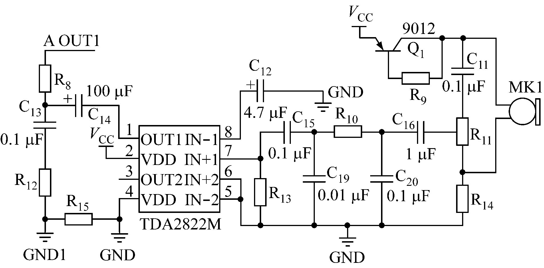 (1) 通话电路。通话电路基于功放集成芯片TDA2822M及其外围电路实现。TDA2822M具有静态电流小、交叉失真小等优点。通话电路原理如图4所示。TDA2822M工作在单声道桥式(BTL)模式,输出功率≥2 W,保证了声音的远距离传输和语音质量。C12用于交流负反馈,确定响应低频下限。C13和R12构成茹贝尔网络,抑制高频高次谐波,使音频更加纯正。输入和输出信号单点接地,避免由高增益带来的自激效应。麦克风拾音孔将拾取的声音信号转换成电信号,在进入音频放大器前,设计低噪声晶体管放大电路,然后通过RC电路进行滤波和去噪,减少声音传输过程中的高频噪声,避免转换过程的失真。放大的信号最后由音频隔离耦合变压器从A OUT1端耦合到系统的音频线上。