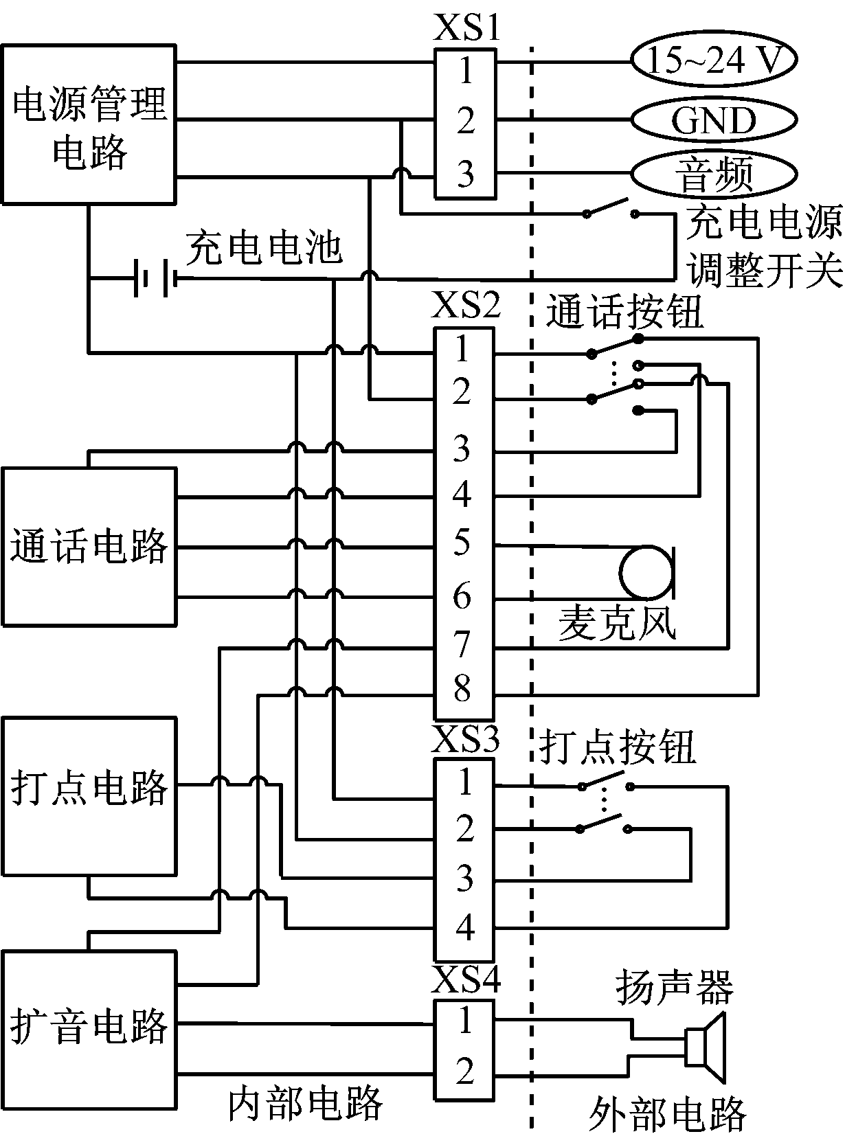 扩音电话主要由通话电路、打点电路、扩音电路、电源管理电路和其他相关器件组成。扩音电话原理如图3所示。该电话由内置的充电电池供电,外部电源(DC15~24 V)只需通过电源管理电路给电池提供一定的充电电流,充放电过程由充放电管理单元进行有效保护和管理。为了降低电话内部电路的功耗,正常情况下,只有扩音电路处于工作状态。当需要使用通话或打点功能时,需要分别按下通话按钮和打点按钮,同时相应电路得电工作,使用结束以后,按钮弹起,电话恢复到扩播状态。