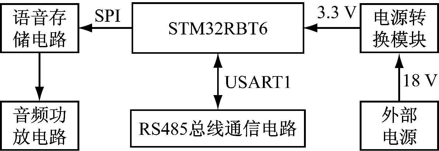 语音报警模块以STM32RBT6为控制核心,包括语音存储电路、音频功放电路、RS485总线通信电路和电源电路等,如图2所示。