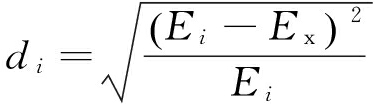 (3) 分别计算未知样本太赫兹光谱信号特征值与已知样本太赫兹光谱信号特征值的归一化距离。以特征能量为例说明计算过程。设Ex为未知样本太赫兹光谱信号的特征能量,Ei(i=1为岩样,i=2为煤样)为已知样本的太赫兹光谱信号特征能量,则二者的归一化距离为