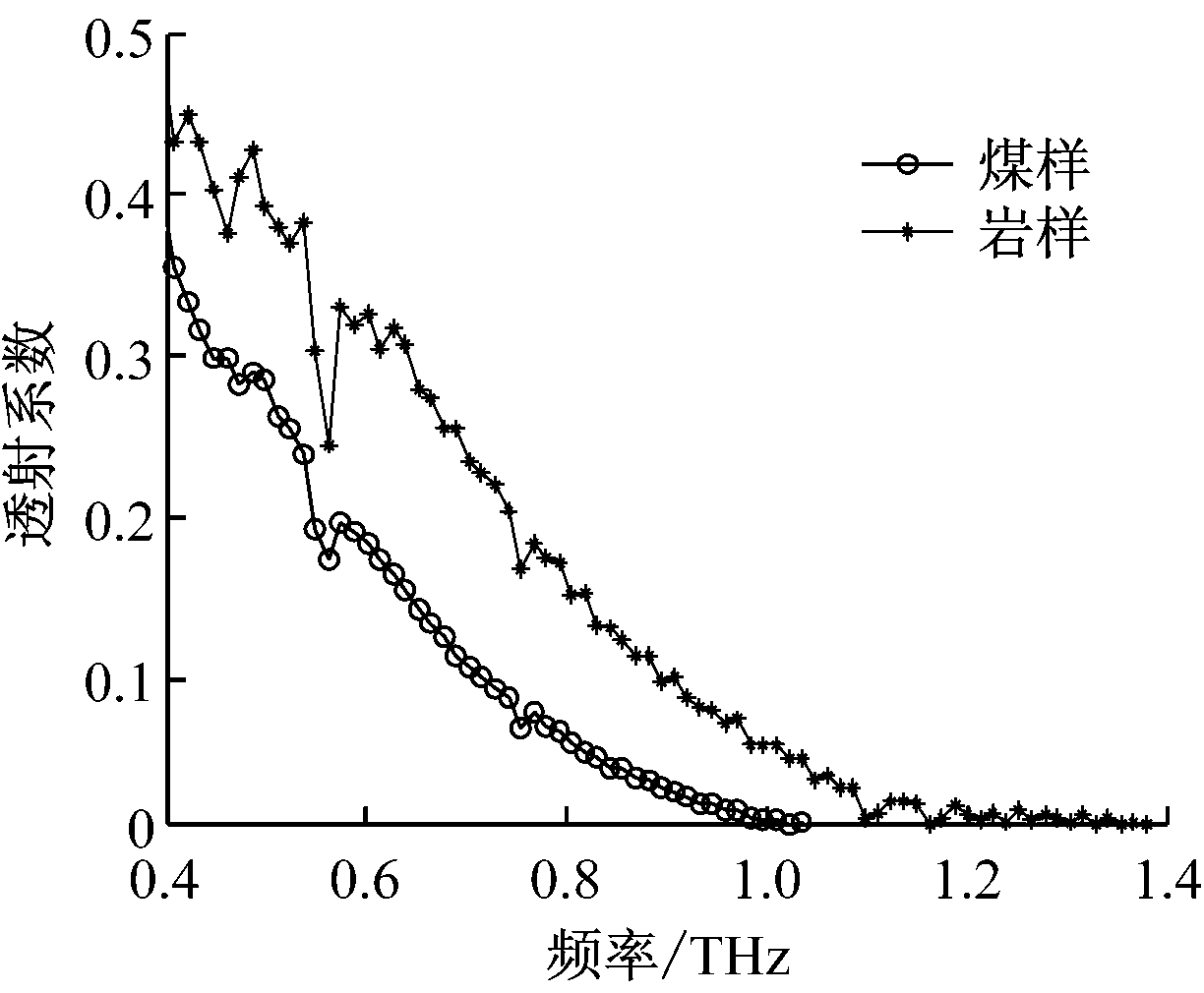由于频谱中0.4~1.4 THz部分的数据差异相对明显,选取该频段对煤样与岩样的太赫兹频谱进行处理,得到煤样与岩样的系统透射函数,如图3所示。可看出:① 煤样与岩样对太赫兹光波的衰减程度不同,煤样对太赫兹波的衰减更大;② 煤样与岩样在0.56,0.75 THz处有极小值,说明太赫兹波在该频率点会产生较大衰减;③ 若以该图纵轴零点为截止点,则岩样的截止频率远高于煤样的截止频率,说明1.1 THz以上的太赫兹波将会被煤样完全吸收,1.4 THz以上的太赫兹波将被岩样完全吸收。