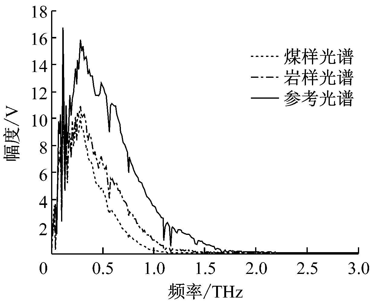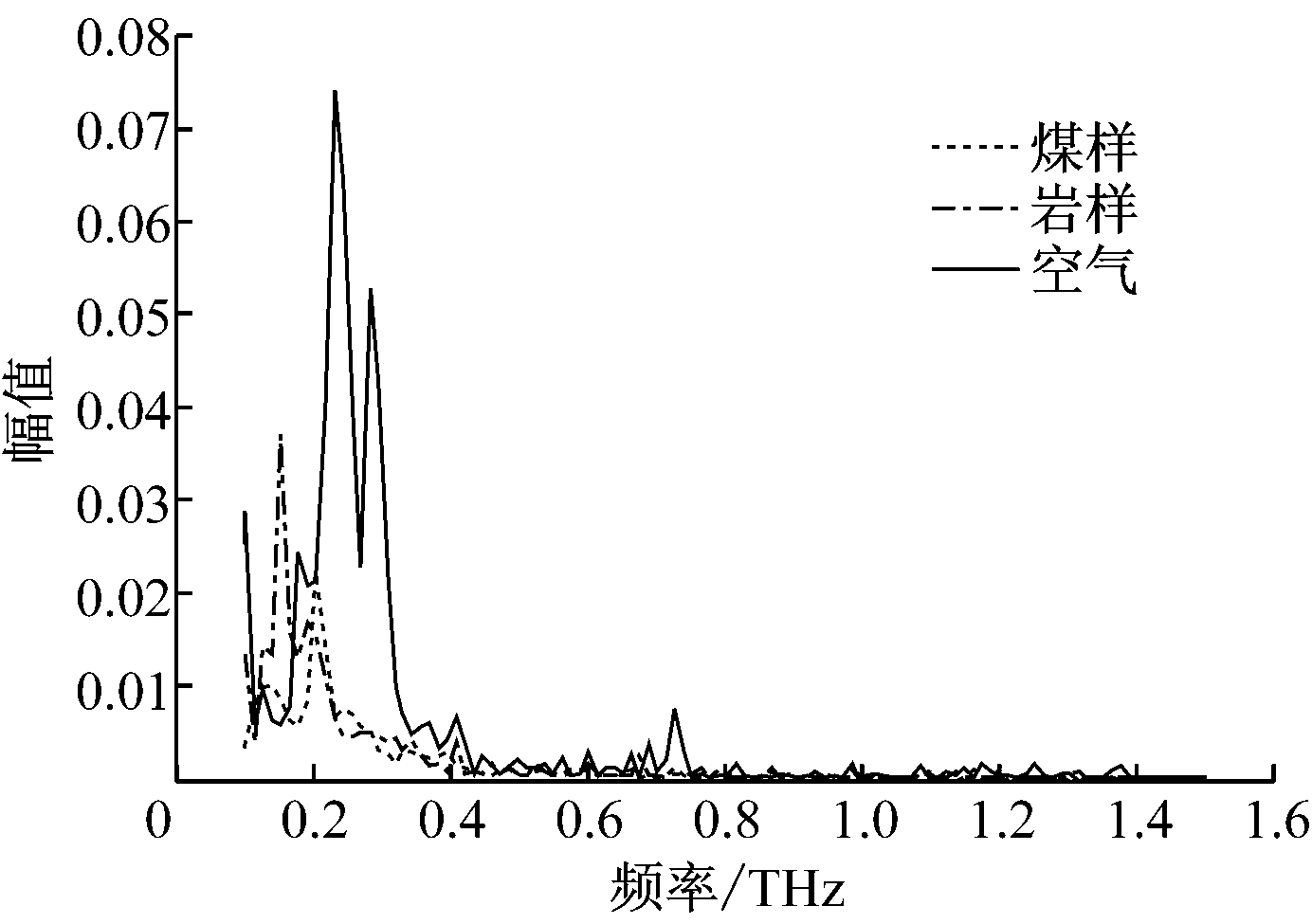 图2为经过快速傅里叶变换得到的煤岩样及空气的太赫兹频谱。与时域谱相比,样品的太赫兹频谱相对于参考光谱产生了显著差异,原因可能是煤样中的复杂分子团(如甲基)及岩样中的原子晶体——二氧化硅吸收电磁波能量产生振动,且各种有机分子振动与太赫兹波电场不一致,从而产生了幅度衰减。总体看来,岩样的太赫兹频谱幅度略高于煤样。