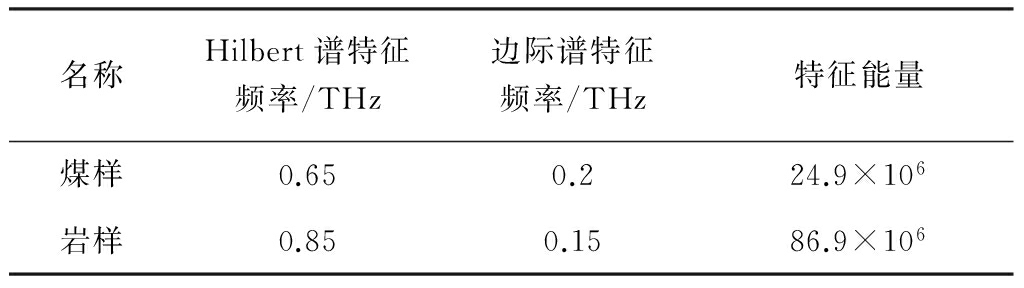 对Hilbert谱进行时域积分,得到Hilbert边际谱,如图7所示。边际谱可准确反映太赫兹光谱信号随频率变化的分布情况。但与傅里叶变换不同的是,边际谱中某一点的频率并不一定时时存在,也不一定只出现1次,而可能是以不同或相同的幅值出现多次。该点对应的幅值是该频率在时间域中的能量之和。一般来说,边际谱的分辨率远高于傅里叶变换结果,且包含了丰富的特征信息[13]。图7中,以幅值峰值点作为信号特征峰,则空气的太赫兹光谱特征峰频率为0.23,0.28 THz,煤样的太赫兹光谱特征峰频率为0.2 THz,岩样的太赫兹光谱特征峰频率为0.15 THz。对比图2、图7可看出,在傅里叶频谱中,样本太赫兹光谱的大部分能量集中在0.1~0.5 THz,这与边际谱中的数据一致,但是后者可以得到更精确和更具有辨识度的频率特征。需要注意的是,经EMD分解后的IMF分量所包含的能量和原始信号能量是不相等的,因此边际谱的幅值只能说明某个频率信号存在,以及其能量相对于其他频率信号的大小,与傅里叶变换结果的幅值不具有比较性。图7中,若定义样品光谱在有效频率区间0.1~1.4 THz, 纵轴平方与横轴所围的面积为太赫兹光谱特征能量函数,则可计算出煤岩样的太赫兹光谱特征能量函数分别为24.9×106和86.9×106。