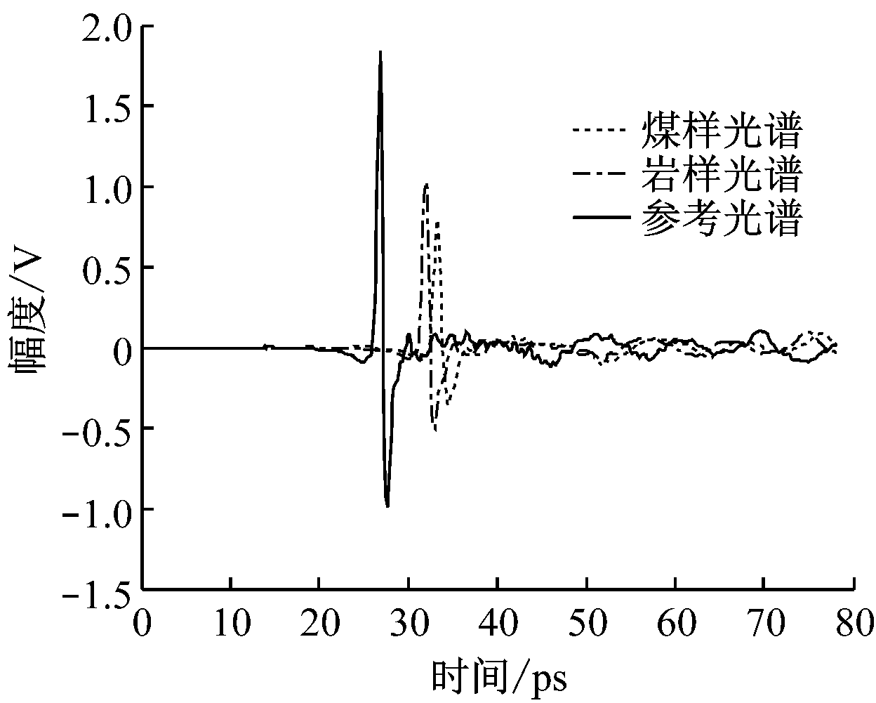 煤岩是一种极复杂的多元混合物,其组成成分难以鉴定,在煤岩领域涉及太赫兹时域光谱技术的文献很少。杨成全等[8]讨论了岩样在太赫兹时域光谱和傅里叶红外光谱下的差异;宝日玛等[9]研究了几种岩石的太赫兹光谱;许长虹等[10]通过太赫兹光谱实验,研究了煤炭中氢含量与挥发分对实验结果的影响;王昕等[11]描述了煤岩介质在太赫兹频段下的介电特性。目前虽然无法通过微观方式详细阐述煤岩介质与太赫兹波的相互作用,但考虑到煤的主要组成成分为碳、氢和氧元素,岩石的主要组成成分为二氧化硅等,且太赫兹波和煤岩物质构成分子之间的相互作用不同,因此太赫兹时域光谱技术有可能为煤岩介质鉴别提供一种新的研究途径。