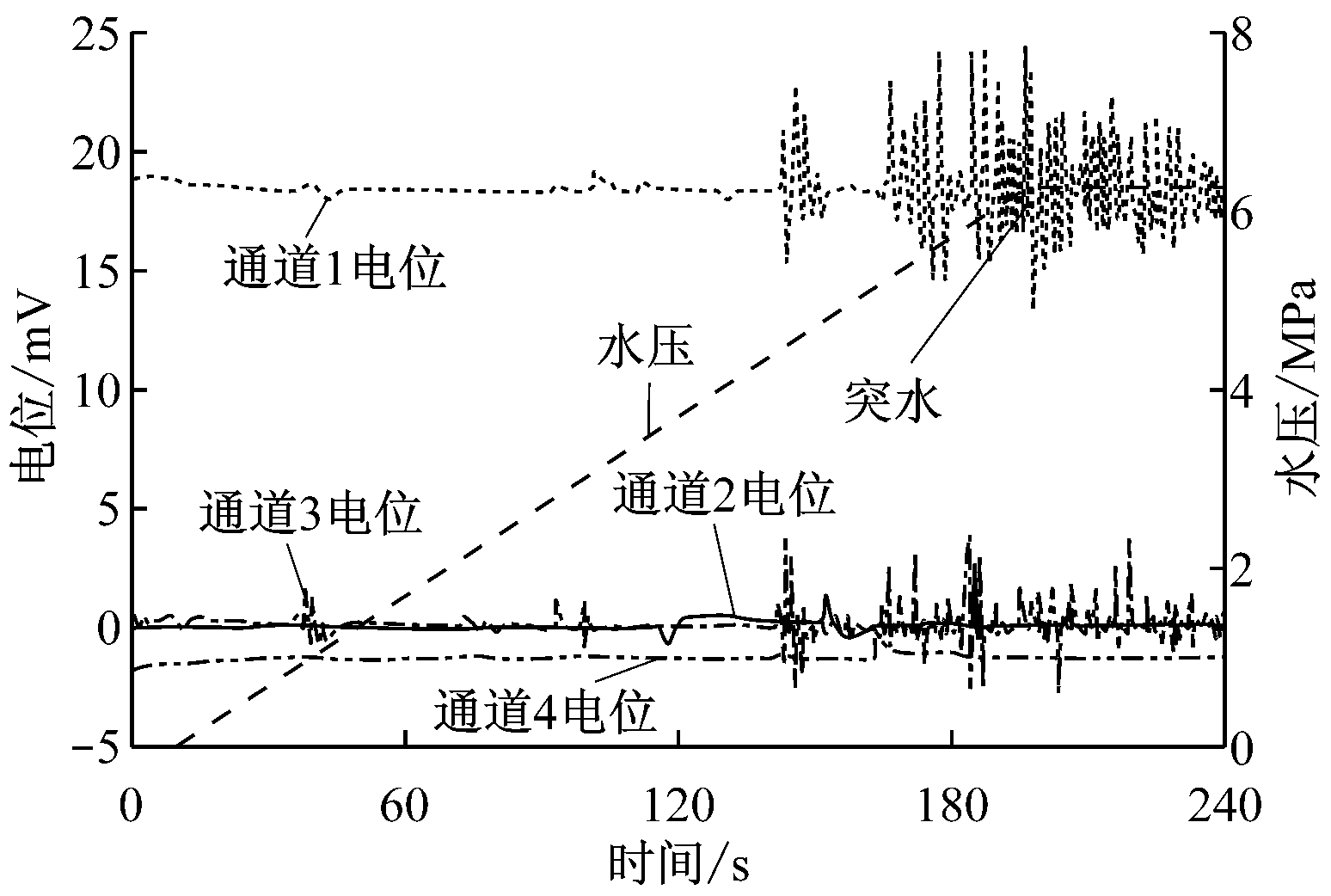 整个试验过程历时约4 min,从10 s开始均匀增加水压,试验进行到195 s时,孔洞底部开始出现裂缝,并有水流出,此时水泵水压约为6.2 MPa。然后保持水压6.2 MPa不变,直到孔洞内部有大量水流出,结束试验。孔洞底部、两侧边及顶部的4片电极分别连接LB-IV型电位数据采集仪的1,2,3,4通道。利用该采集仪动态跟踪监测突水模拟试验全过程。测量数据经相关程序处理,得到突水过程水压及煤岩表面电位变化,如图2所示。