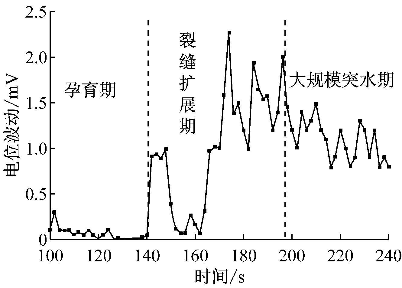 根据煤岩表面电位变化规律,可以将突水演化过程分为孕育期、裂缝扩展期、大规模突水期3个阶段,如图4所示。在突水孕育期,煤岩体损伤程度较小,没有形成较大的裂缝,巷道内表面电位信号比较稳定,波动幅度较小。在裂缝扩展期,导水裂缝开始扩展,表面电位波动开始增强,波动幅度增大,导水裂缝逐渐延伸,最终到达巷道底部,形成导水通道,表面电位剧烈波动,波动幅度约为孕育期的1~15倍。在大规模突水期,煤岩体发生失稳,大量水涌向巷道,表面电位信号大幅波动,波动幅度为稳定期的3~10倍。
