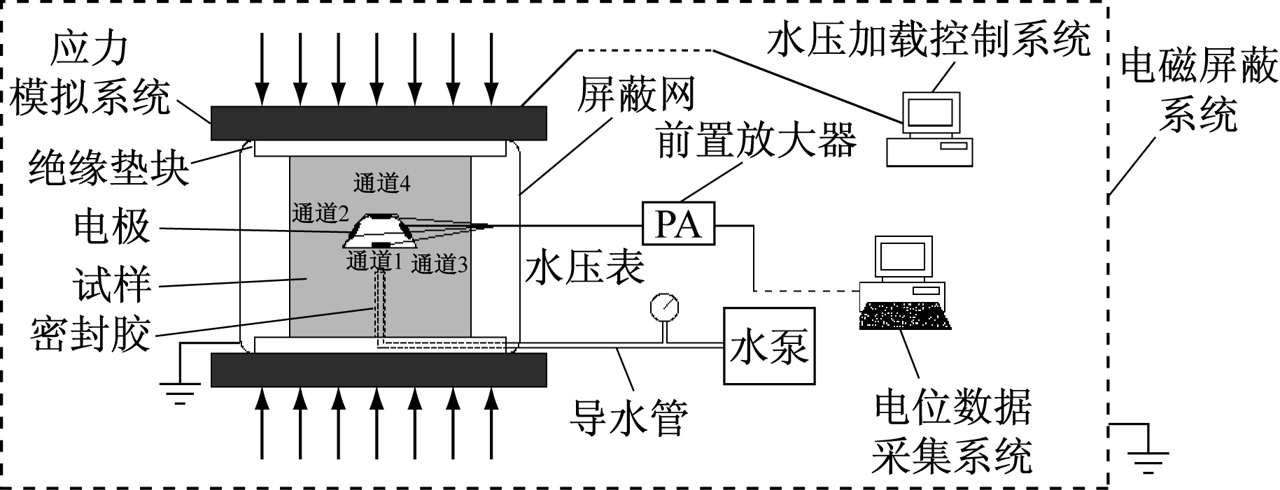 突水的煤岩表面电位模拟试验系统由应力模拟系统、电位数据采集系统、水压加载控制系统、电极及电磁屏蔽系统等组成,如图1所示。