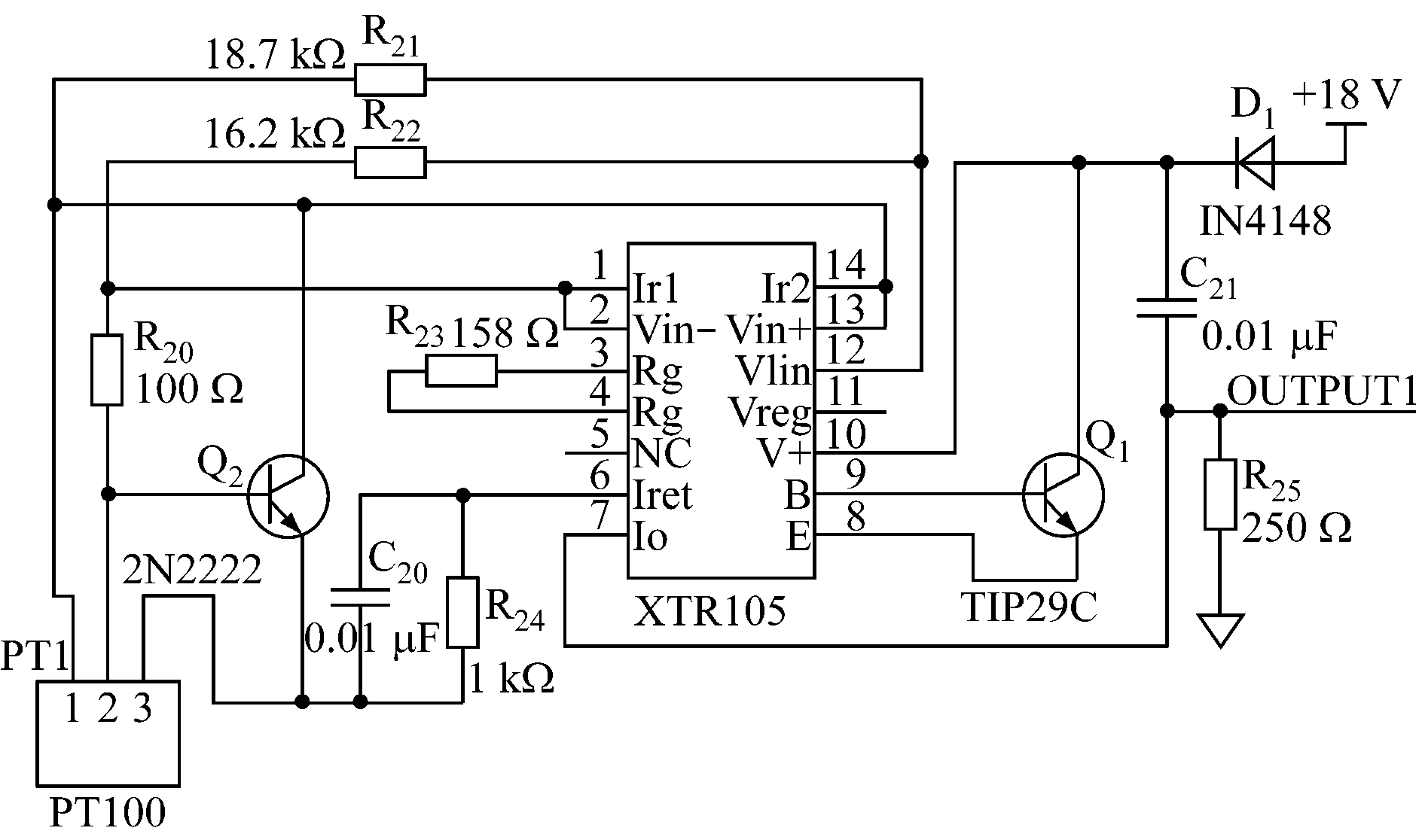铂电阻的温度特性呈非线性,其未校正的最大非线性度为4%~5%,是影响铂电阻温度传感器测量精度的主要原因,因此采用基于XTR105[5]的温度信号调理电路(测温范围为0~200 ℃),如图2所示。XTR105内置线性化电路,通过外接电阻(R21和R22)可对传感器量程范围内的温度特性的非线性进行校正。为保证测温精度,采用高精度、低温漂金属膜电阻,其中250 Ω和100 Ω电阻精度为0.1%,其余电阻精度为1%。