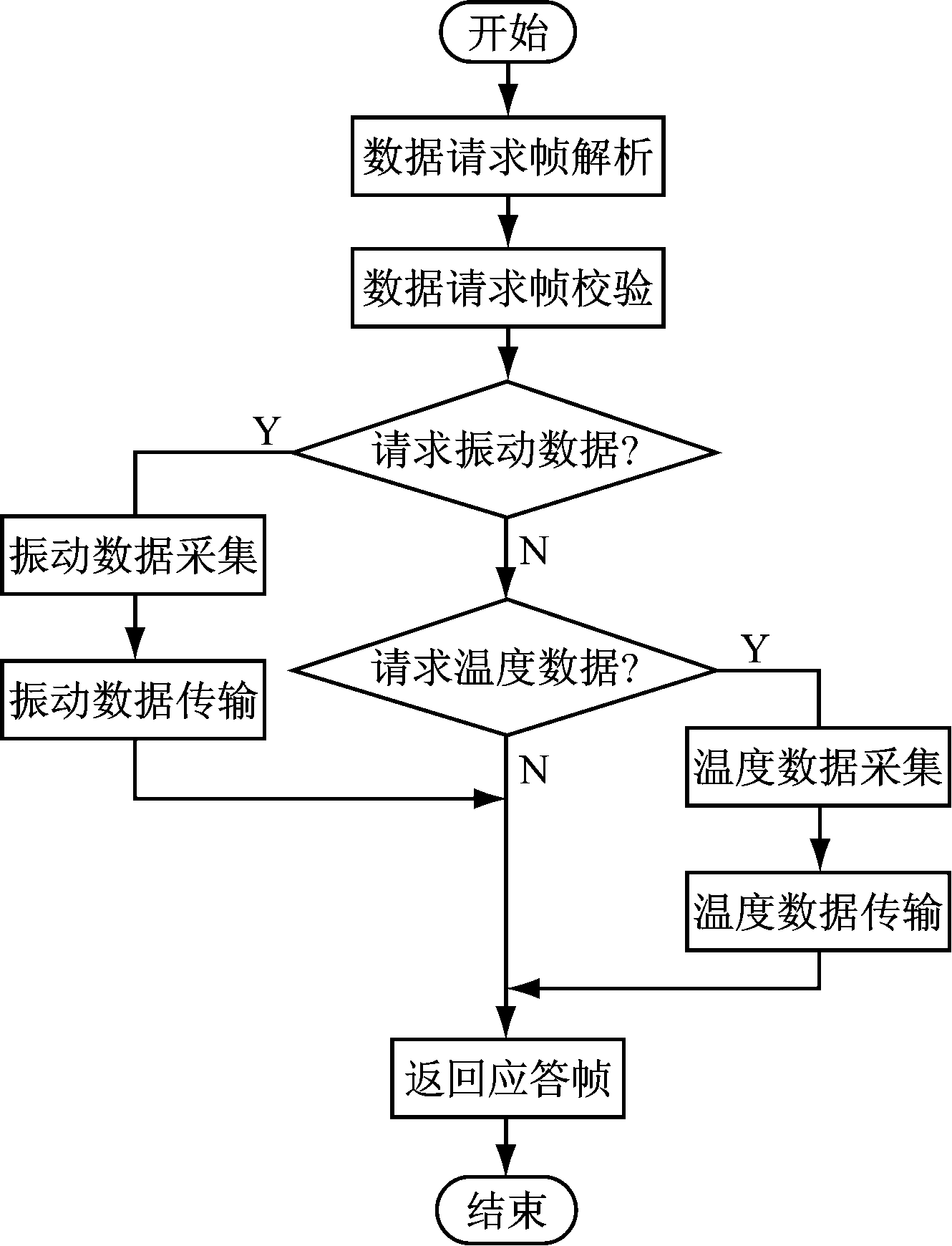 请求帧处理子程序流程如图8所示。首先对主站发送的数据请求帧进行解析与校验,再根据数据请求帧携带的指令完成相应任务(如温度、振动数据的采集与传输),并返回相应的应答帧给主站。
