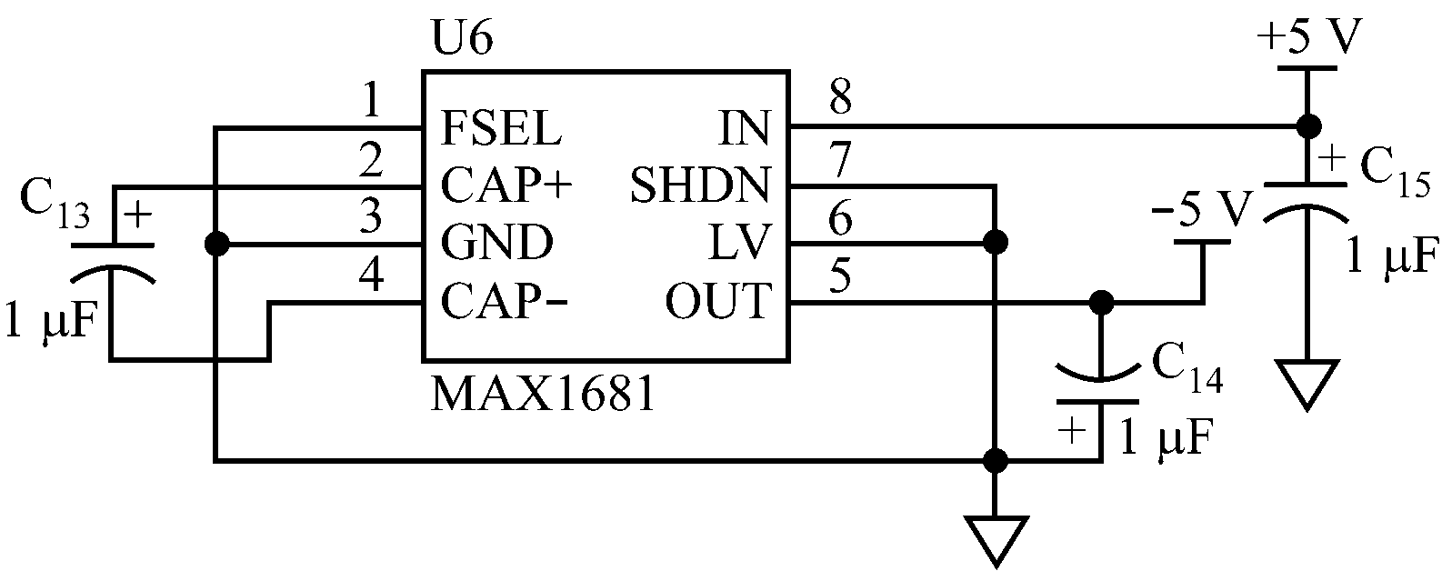 振动信号调理电路中的运算放大器OP07所需电压为±5 V,若直接用DC/DC隔离稳压电源对18 V本安电源进行降压,其内部等效电容过大,不符合本安要求[8]。因此,先通过DC/DC隔离稳压电源URB2405YMD-10WR3降压至+5 V,再选用MAX1681进行电压转换,实现-5 V电压供给。+5 V转-5 V电路如图5所示。此外,通过AMS1117-3.3将+5 V电压降至+3.3 V为其他电路提供合适电压。