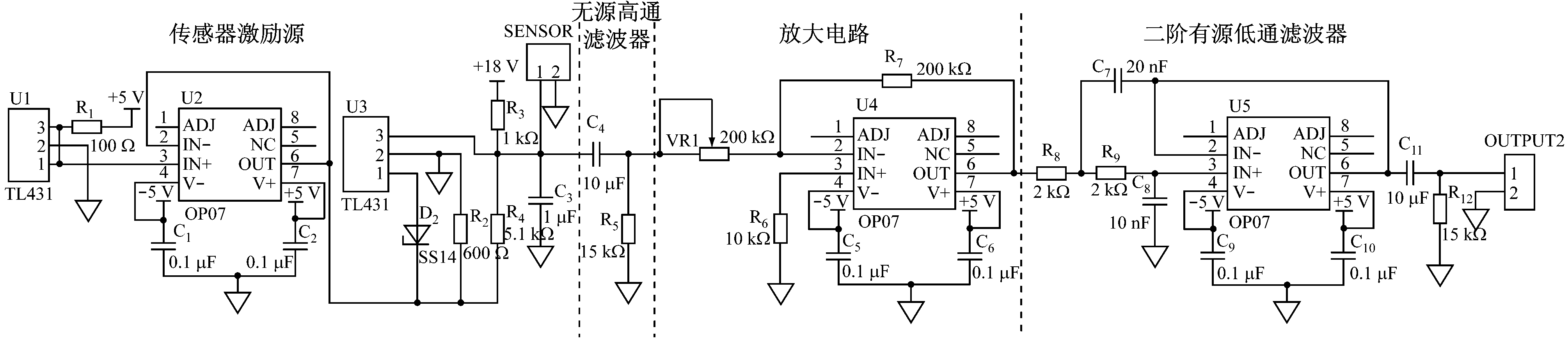 振动信号调理电路为矿用本安型振动传感器提供激励,并对传感器输出信号进行隔直、滤波、放大[6],如图3所示。传感器激励源为振动传感器提供16~21 V直流激励电压和4~20 mA恒定激励电流。传感器输出信号包含设备振动信号经传感器转换后的电信号和激励源电路中的直流分量,为消除直流分量和测量频率范围(1~5 kHz)外的低频成分对有用信号的干扰,通过电容C4和电阻R5构成的截止频率约为1 Hz的无源高通滤波器实现隔直与滤除低频噪声。此外采用U4及其外围电阻、电容构成的放大电路对信号进行放大,采用低频增益为1、截止频率约为5 kHz的二阶有源低通滤波器来滤除高频噪声并压缩频带,从而提高信噪比,避免频谱混叠。