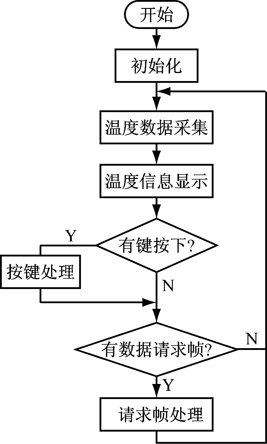 在Keil uVision4编译环境下采用C语言对监测子站软件程序进行模块化设计[10],包括主程序、初始化子程序、温度数据采集子程序、温度信息显示子程序、温度数据传输子程序、振动数据采集子程序、振动数据传输子程序、按键处理子程序和请求帧处理子程序。
